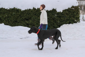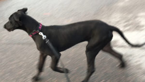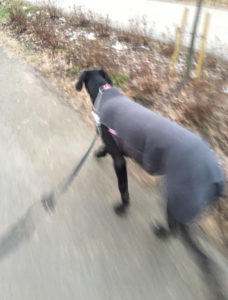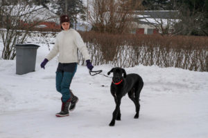 Esimerkki 3): Kuljemme jalkakäytävää, kun jo kaukaa näen vastaan tulevan pariskunnan pienen koiran kanssa. Hetken kuluttua myös Nemi huomaa tulijat, hidastaa omaa vauhtiaan, hörökorvat ovat tanassa. Tuijottelu jatkuu, koirani kuulokorvat katoavat. En saa katkaistua tuijottelua millään, en edes nameilla. Sen aikeet ovat ystävällisiä, mutta ne ovat liian vauhdikkaita – ja ei-sallittuja. Kohdalle tullessa vastaantuleva koira tekee yllätyshypyn, ja Nemi karahtaa takajaloille ja yrittää hypätä koiran luo. Seuraavan kahden sekunnin sisään mahtuu minun epätoivoinen yritys pysyä pystyssä, saada pidettyä koirani hallinnassa, parantaa otetta koirastani, samalla kun Nemi onnistuu olemaan yhtäaikaisesti edessä, takana, jalkoihini sotkeutuneena, Joka Paikassa, melkein kampaten minut. Kunnon häröpallo. Ohi päästiin, mutta suoritus oli kaukana tyylikkäästä. Ihmiset saattoivat jäädä miettimään, että miksi tyttö ottaa itselleen niin ison koiran, ettei saa pidettyä sitä hallinnassa.
