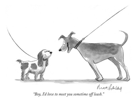 Jos joku asia maailmassa voi olla vaikea opettaa koiralle, on se toisten koirien ohittaminen. (Toinen on muuten haukkumisen pois kitkeminen). Mikä ihme siinä voi koiran mielestä olla niin ihmeellistä, että vastaan tulee toinen koira? Enhän minäkään vouhkaa kieli pitkällä ilmaan hyppien, että TUOLTA TULEE TOINEN IHMINEN!! KATSO, SILLÄ ON PÄÄLLÄÄN VIOLETTI TAKKI!! VIOLETTI!!! LEIKITÄÄNKÖ?! En varmaan ollut pikkulapsenakaan tuollainen joka ikistä ohittamaani ihmistä kohtaan?