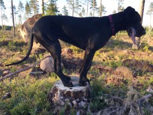Tässä keikkuessa koiran tassut ovat jo hyvin lähellä toisiaan, ja se joutuu tasapainottelemaan itseään jo koko kropallaan – ja tietenkin tässä jouduttiin killuttelemaan hetki kuvan ottamista varten… 😉  Seuraavaksi sitten vaan vielä pienempää kannonnokkaa, että saadaan kaikki neljä jalkaa ihan suppuun!