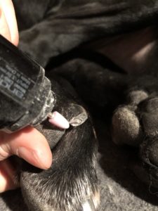 Erityisen innoissani lähdin kokeilemaan trimmeriä Nemin vahingoittuneeseen kynteen, joka on kasvanut muita kynsiä leveämmäksi, vähän niin kuin “tasapaksuksi” pötikäksi ja sitä on ollut todella vaikea leikata. Trimmerin mukana tulevalla, kapealla viimeistelykivellä kykenin hiomaan kynnen vaikeammistakin kolosista ainesta pois, joten trimmeri toimi aivan tässäkin loistavasti.