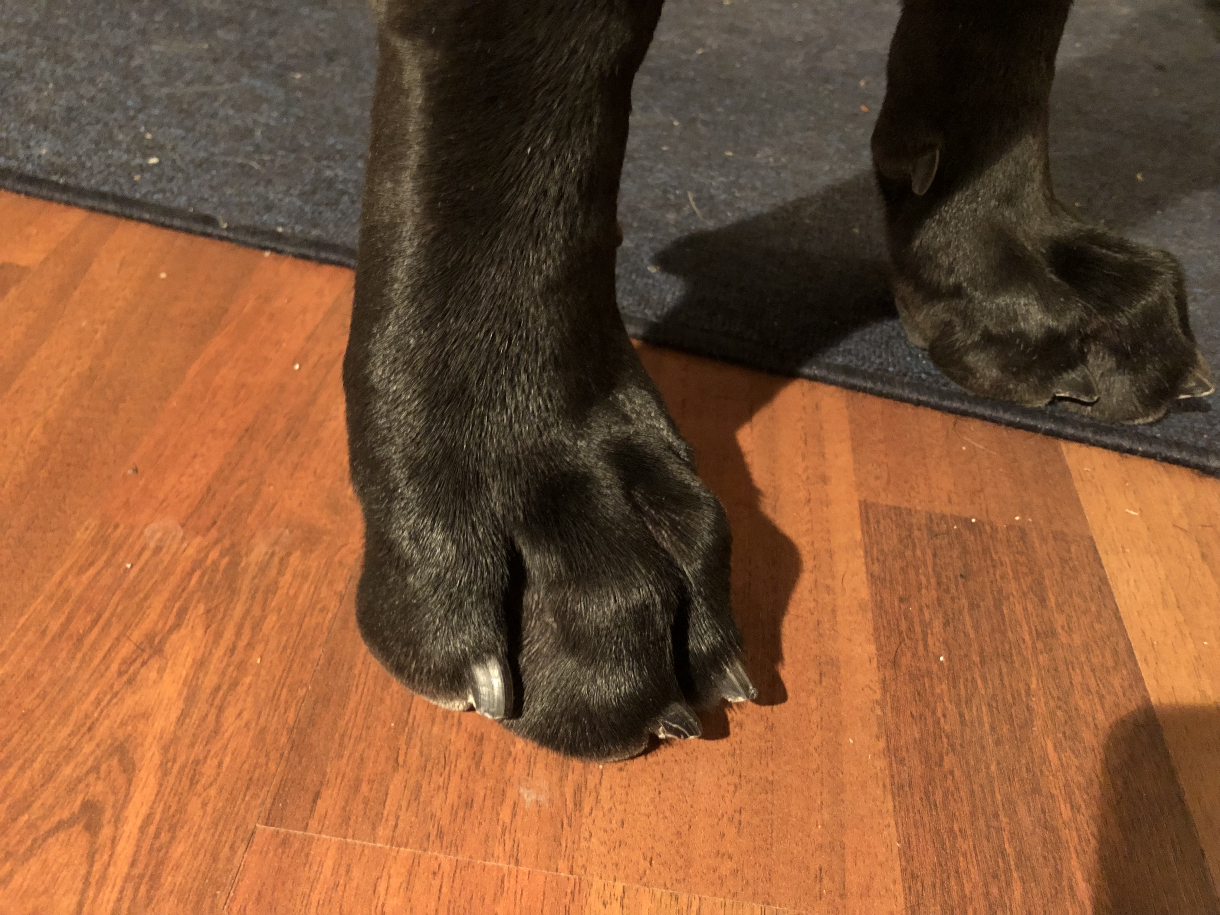 Tällä kertaa en leikannut kynsiä ensin, koska mulla oli niin kova kiire ja hinku päästä testaamaan laitetta, etten edes ajatellut, olisiko kynnet kannattanut ihan lyhentää-leikata alle. 😀 Pienempien koirien ja kynsien kohdalla ilmeisesti tällä kynsitrimmerillä pitäisi pystyä myös lyhentämään kynnet (jyrskytetään terää paikallaan niin kauan, että kynnen terävä kärki vaan lyhenee pölisten :D), mutta tanskandoggin kynsi on kyllä niin paksua tekoa, ettei taitaisi se yksi latauskerta riittää. 🙂 Mutta sen verran vakuuttunut olen tästä trimmeristä, että taidan hankkia oman version kotiin ja yhdistää perinteiseen leikkuuseen tämän hiomisviimeistelyn.