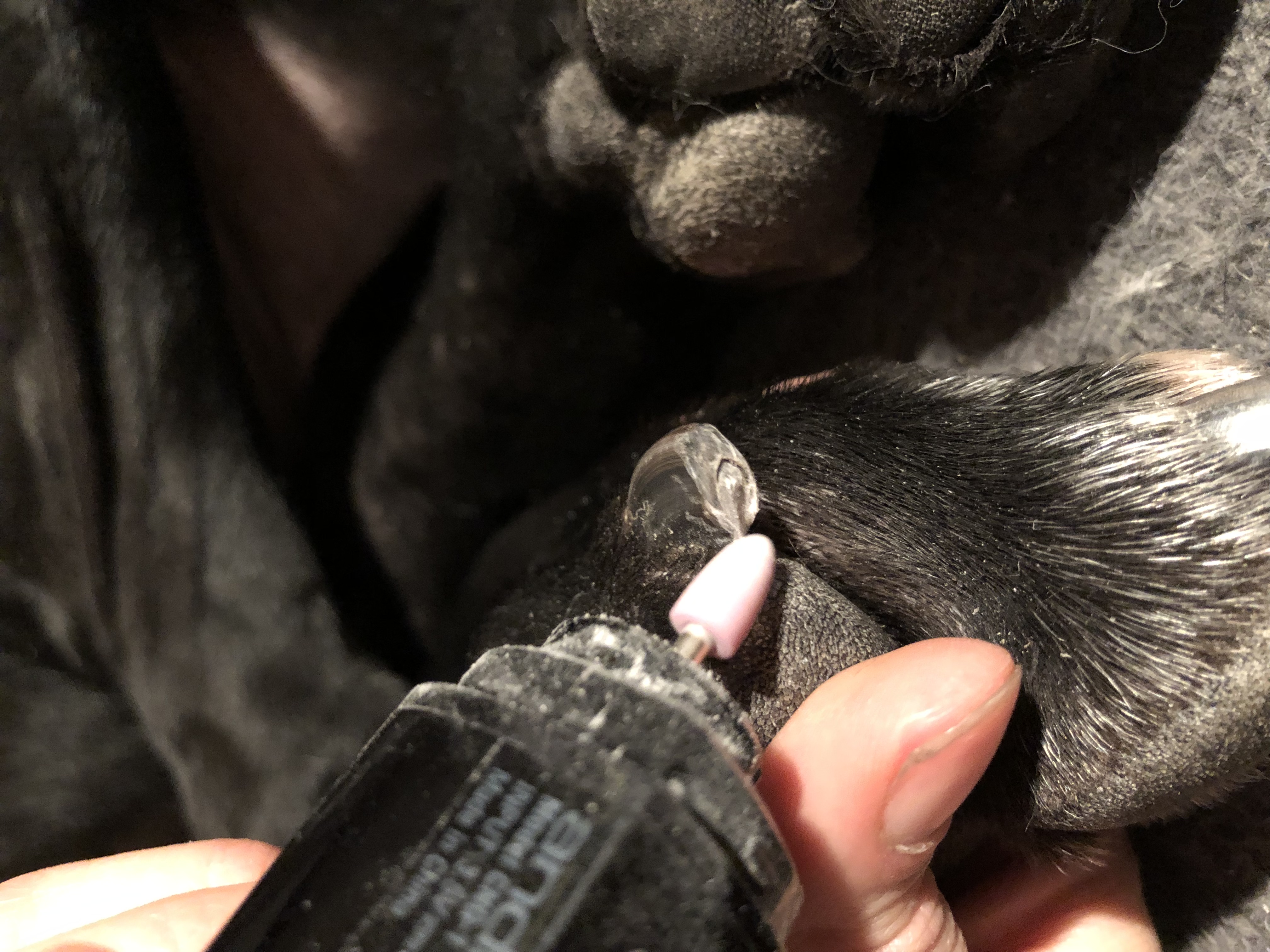 Erityisen innoissani lähdin kokeilemaan trimmeriä Nemin vahingoittuneeseen kynteen, joka on kasvanut muita kynsiä leveämmäksi, vähän niin kuin “tasapaksuksi” pötikäksi ja sitä on ollut todella vaikea leikata. Trimmerin mukana tulevalla, kapealla viimeistelykivellä kykenin hiomaan kynnen vaikeammistakin kolosista ainesta pois, joten trimmeri toimi aivan tässäkin loistavasti.