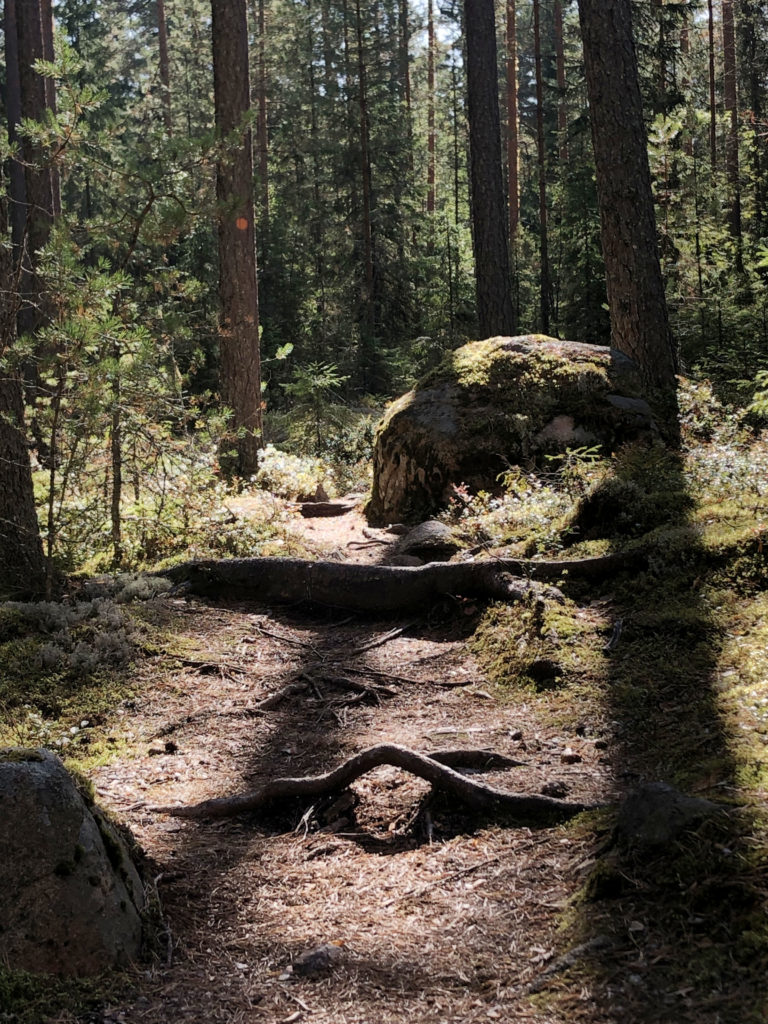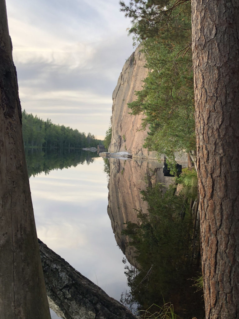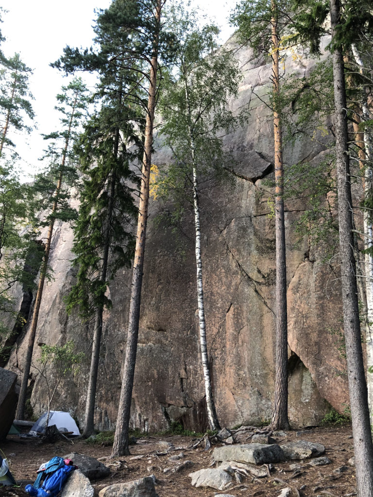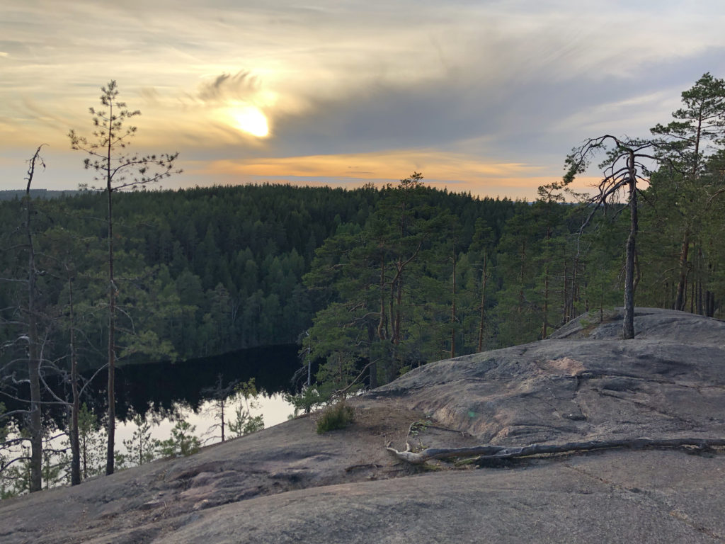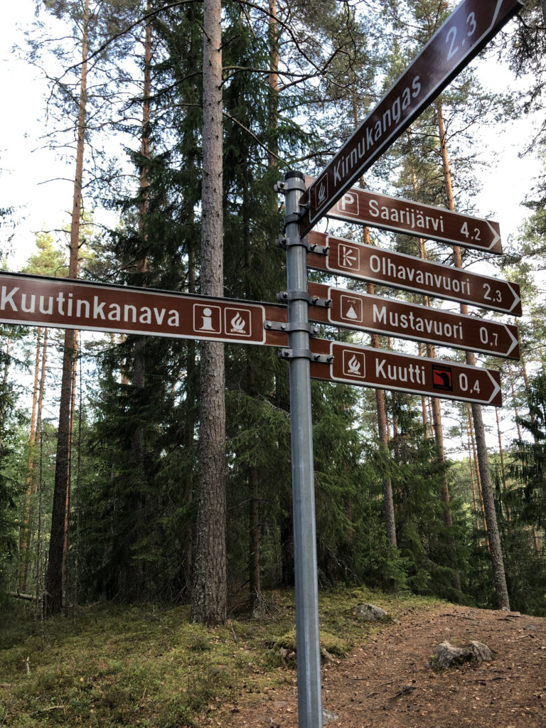 Me päätimme kuitenkin jättää telttasaunat väliin, sillä meillä oli muita suunnitelmia: halusimme näyttää reissuseurallemme Olhavanvuoren. Heti kun ruoat olivat siirtyneet kupista vatsanpohjalle, pakattiin leiristä mukaan välttämättömimmät, kuten vesipullo ja kamera, ja lähdettiin taittamaan vielä seuraavaa taivalta vähän kevyemmin varustein. Tämä oli itse asiassa ensimmäinen kerta myös minun telttailuhistoriassa, jossa rinkkojen kanssa raahustetun päiväreissun päälle tehdään vielä toinen lenkki – ja vieläpä pimenevää iltaa vasten 🙂