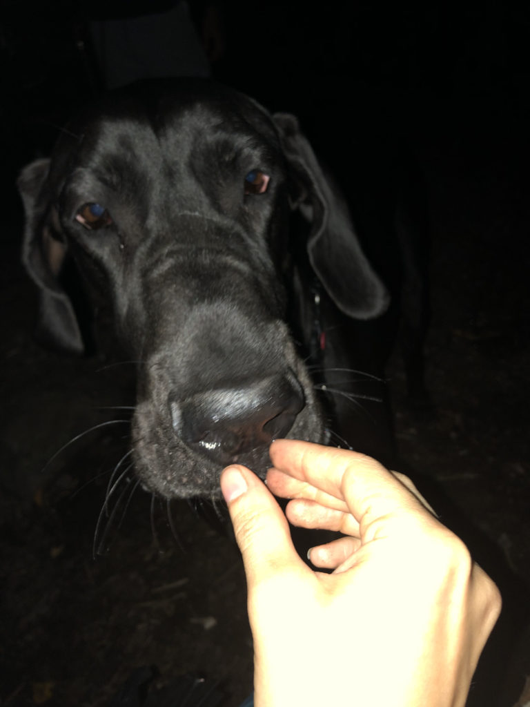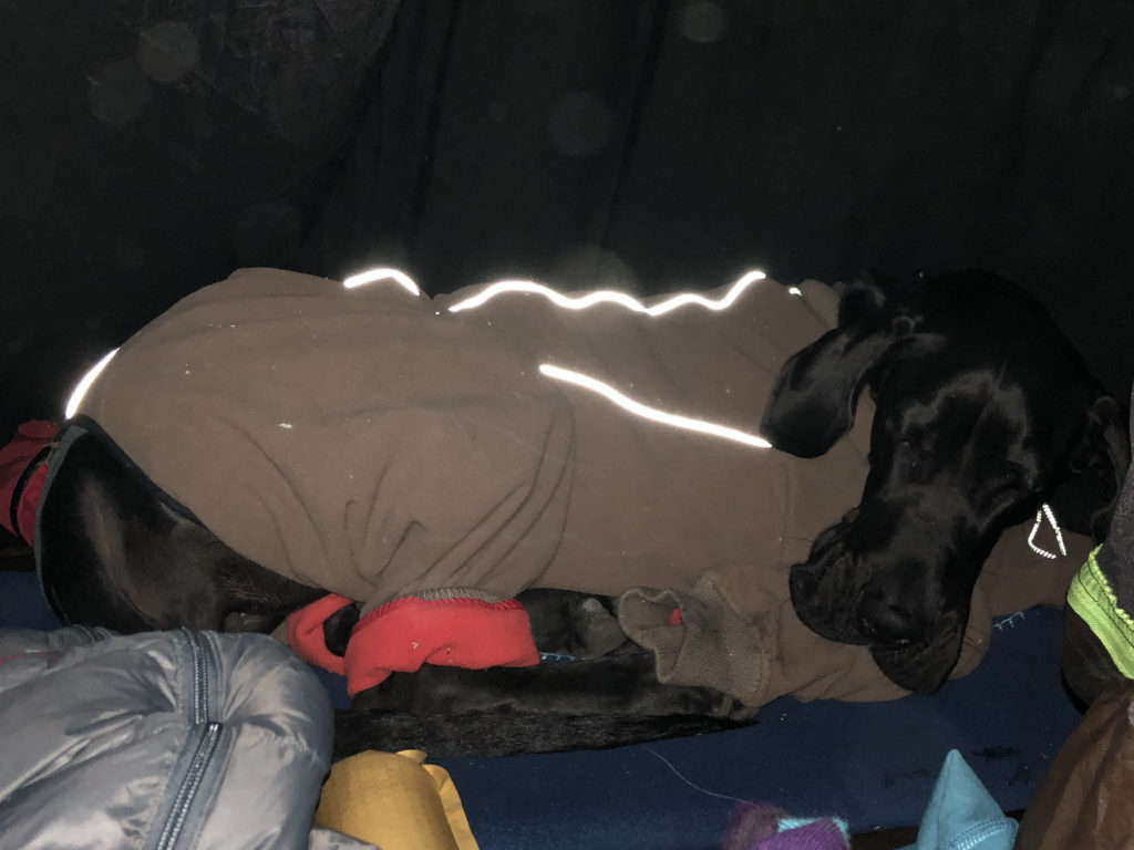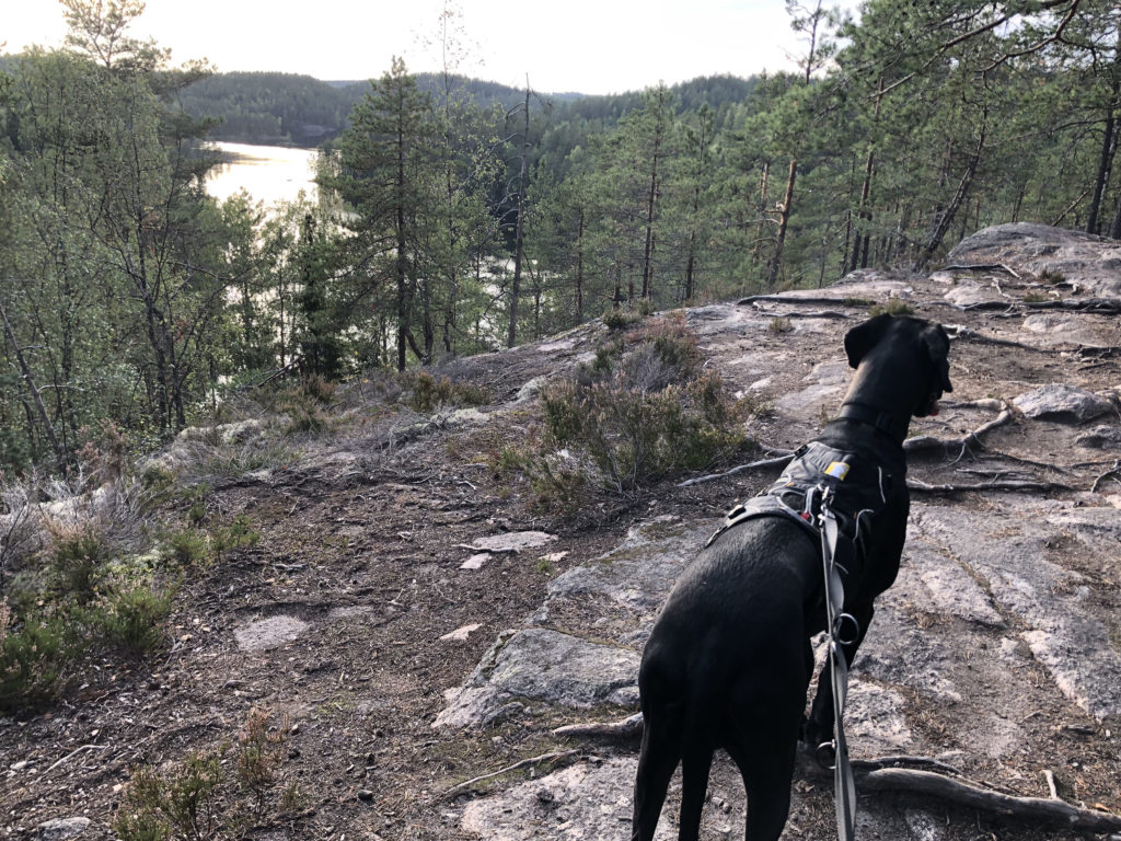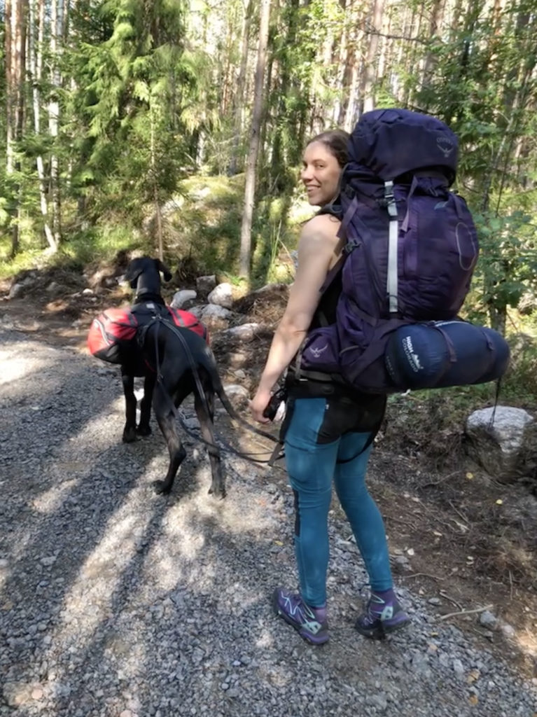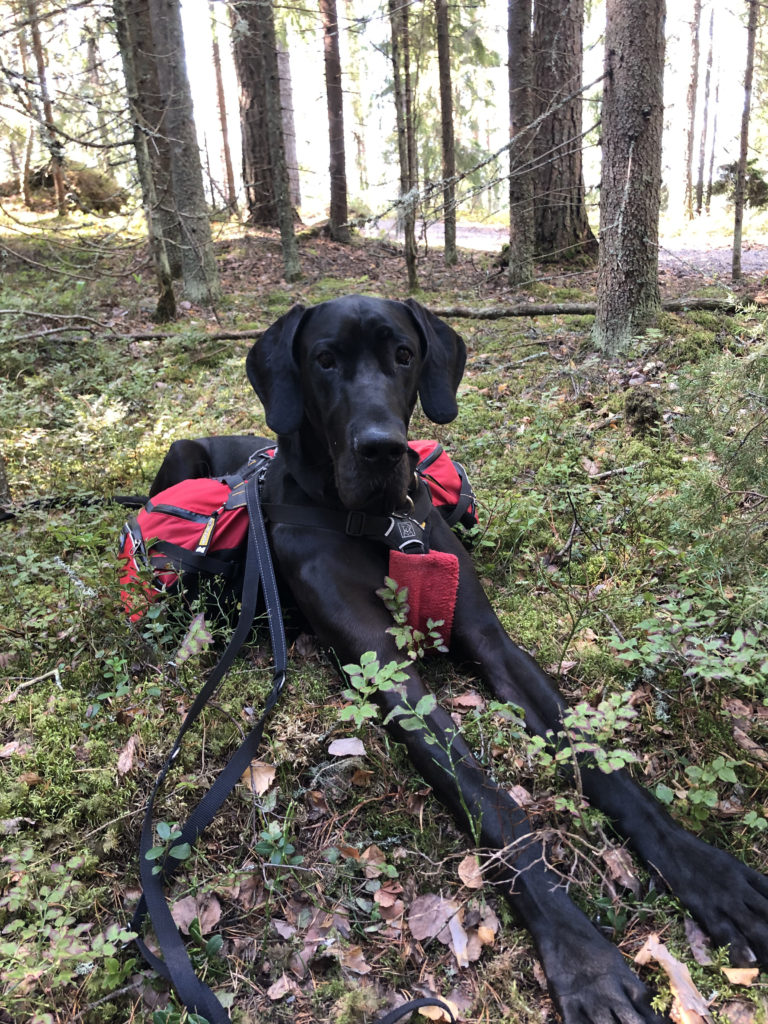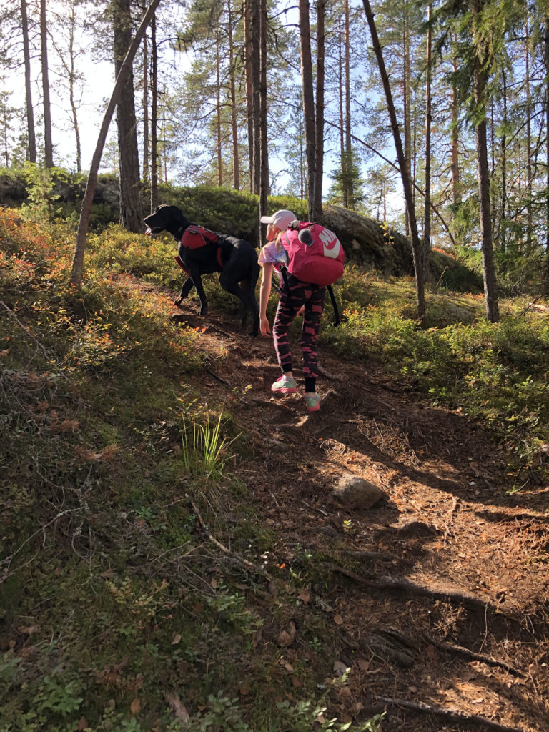 Mites sitten meillä meni telttaillessa, 12-vuotiaan nuoren neidin sekä tanskandoggin kanssa? Ei varmaan paremmin olisi voinut mennä. Tytöt olivat tietenkin toisilleen entuudestaan tuttuja, ja yöpyminen ja yhdessä vaeltaminen sujui todella mainiosti. T halusi jo alkumatkasta päästä taluttamaan Nemiä. Aluksi kokeiltiin varovaisesti pieni pätkä, ja sitten kun T huomasi Nemin tuoman helpottavan vetoavun nousuissa ja ylämäissä, halusi hän taluttaa Nemiä enemmänkin. Ja koska Nemi käyttäytyi hihnassa hienosti ja rauhallisesti (ja totteli minun kauempaakin huutelemiani käskyjä), uskalsin T:n antaa taluttaa Nemiä pitkiäkin matkoja. Itse asiassa siinä taisi käydä niin, että hän talutti Nemiä suurimman osan matkasta! Hihna kuitenkin siirtyi minulle aina, kun näimme ihmisiä tulevan vastaan tai kun lähestyttiin nuotiopaikkoja.