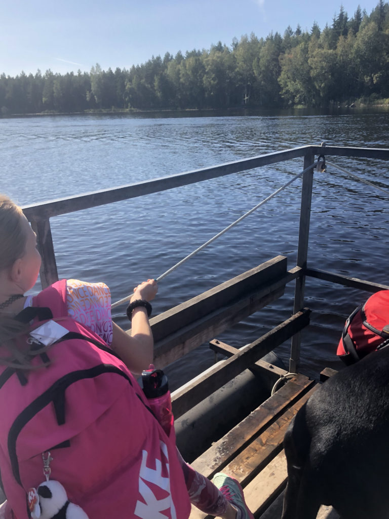 Reissu alkoikin heti T:n mielestä kovin jännittävällä osuudella, kun vain pienen kävelymatkan jälkeen päästiin matkaamaan Kapiaveden yli käsikäyttöisellä lossilla. Nemi matkusteli lossilla kuin vanha tekijä (no hei, onhan se matkustanut lossilla jo aiemminkin – duh,kerran!). Lossin jälkeen reittimme valikoitui Katajajärven kautta Kuutinkanavalle, jonne perustimme leirimme. Iltapäivä oli jo ehtinyt venähtää pitemmän puolelle, joten seuraavaksi oli aika valmistaa päivällistä.