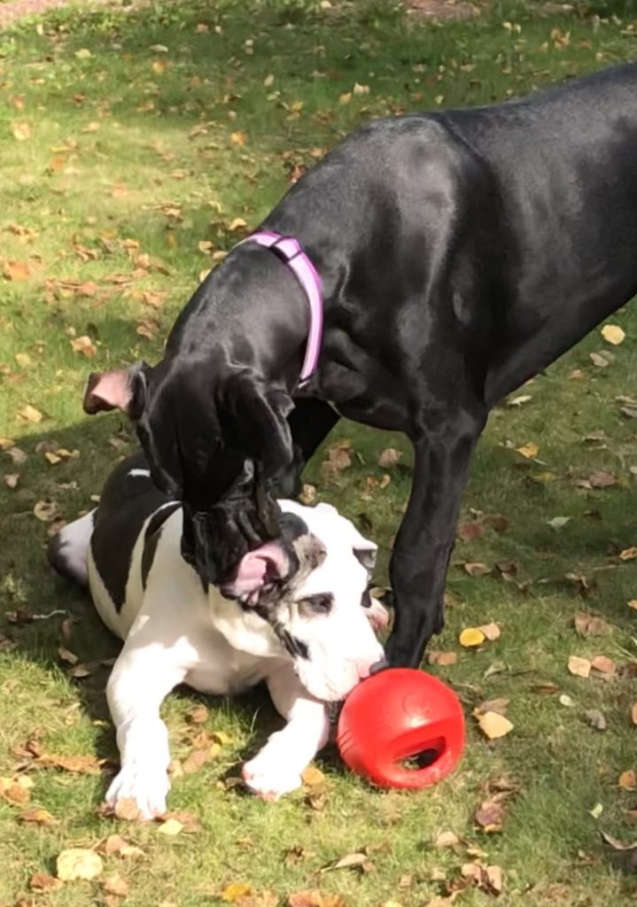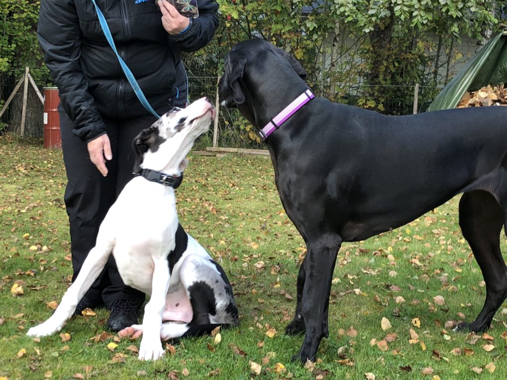 Pennun ensireaktio Nemin tullessa ensimmäistä kertaa kohti oli hyvin pentumainen: vinkupiippausitkua ja juosten karkuun kamalan isoa koiraa. Alkuun turvaa haettiin ihmisen luota, mutta eipä aikaakaan, kun pentu uskalsi jo toimia täysin omatoimisesti ja painatti menemään Nemin kanssa!