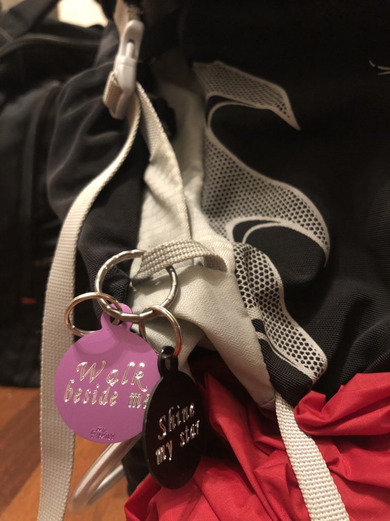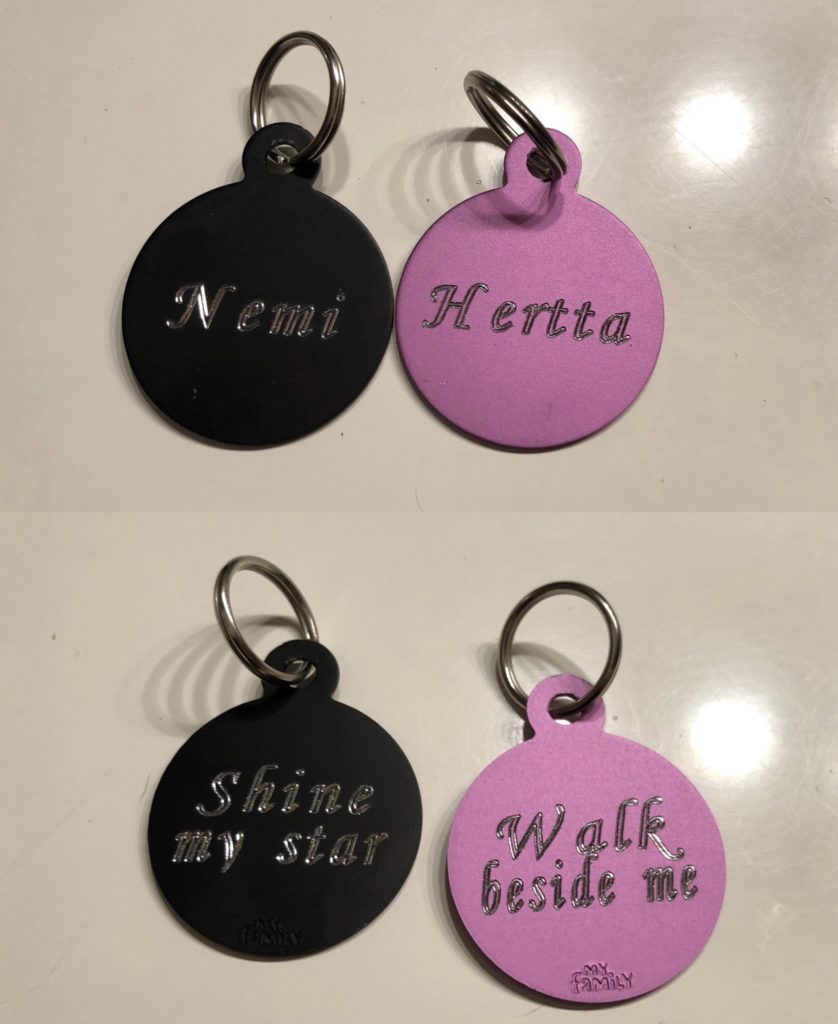Mikko sai myös aika kauniin ja kivan idean. Hän keksi, että voisimme ottaa nämä muistolaatat jatkossa mukaan rinkkoihimme. Näin tytöt (Nemi ja Hertta) kulkisivat aina mukanamme jatkossakin vaelluksilla, joita he koko elämänsä pääsivät kanssamme tekemään. Idea oli mielestäni kaunis, ja vein sitä vähän eteenpäin: kaiverrutin tytöille omat retkilaatat. Alkuun suunnittelin laattoihin yhtenäistä tekstiä, tyyliin “Never walk alone”, mutta sitten ajatus jalostui vielä vähän eteenpäin. Nyt laatoissa lukee omat, persoonalliset tekstit kummallekin.