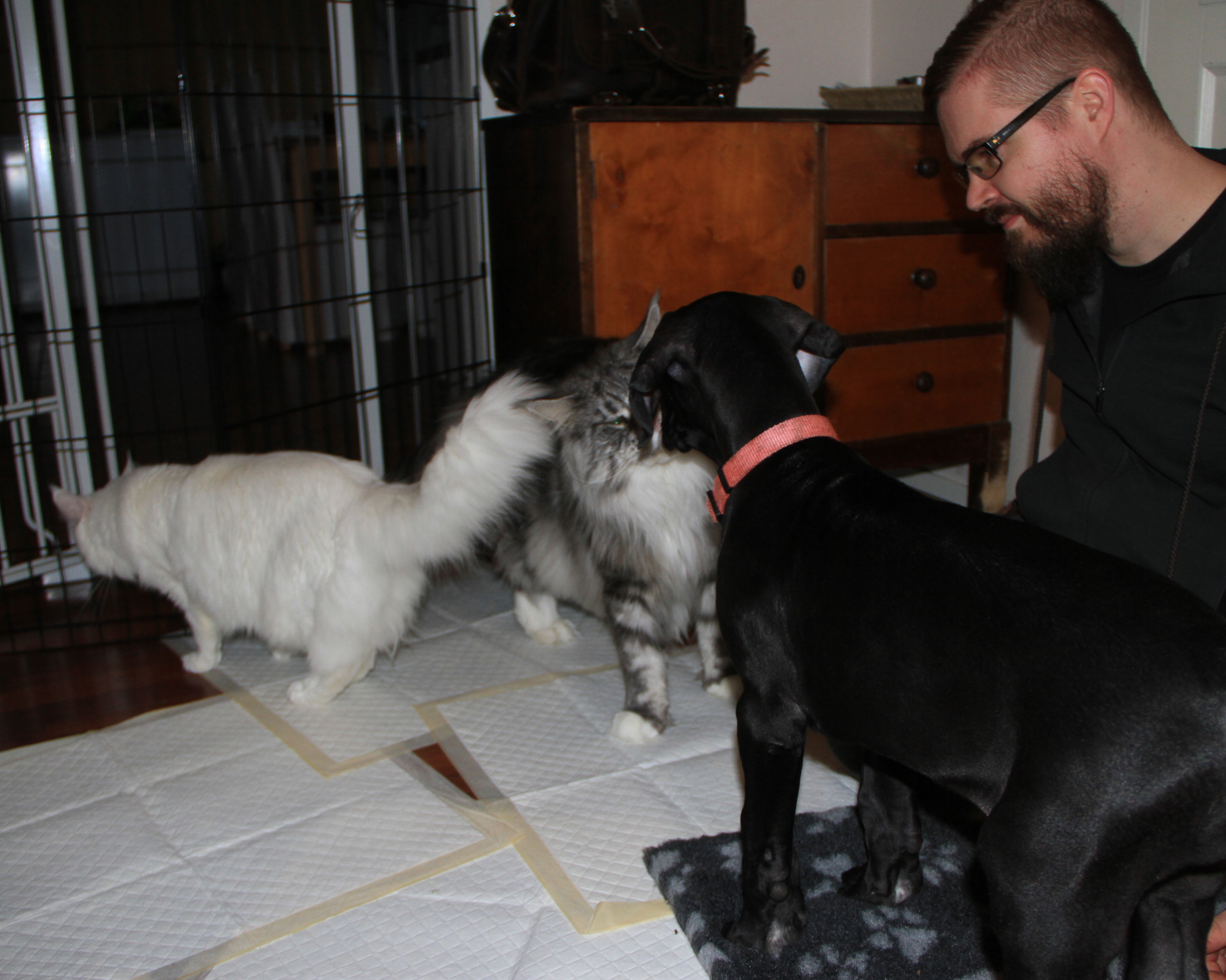 Kotona Nemiä odotti kaksi kummastunutta silmäparia. Maine coonit Lumi ja Igor tulivat tervehtimään uutta tulokasta erittäin kohteliaasti, rauhallisesti ja ystävällisesti. Ihanat kissat <3 Nemin suhtautuminen kavereihin oli kiinnostunut, mutta rauhallinen – niitä seurattiin tarkasti, muttei maksanut vaivaa esimerkiksi nousta pediltä. Luulenpa kyllä vain, että muutaman viikon päästä on toinen vauhti kissojen perässä…