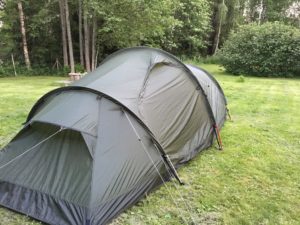 Telttamme on Fjällräven Abisko Shape 3, kolmen hengen tunneliteltta. Teltta on kyllä mitoitettu ehkä kolmelle ihmiselle, mutta kahdelle ihmiselle ja aikuiselle tanskandoggille nukkumatilat ovat suhteellisen kapeat. Hyvänä puolena todettakoon teltan keveys (2,5 kg), mikä vaikuttaa kokonaiskuvassa erittäin paljon, kun sitä tavaraa rinkkaan muutenkin kertyy.