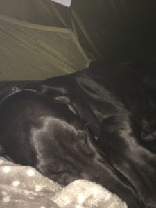 Nemin telttailuvarustukseen ei kuulunut tällä kertaa kuin omat tutut peti, viltti sekä varoiksi puruluu, jos teltassa tulisikin pennun mielestä tylsää. Viltin otin mukaan tuomaan mahdollisesti lisälämpöä yöllä, ja hyvä että otin; kolmen-neljän aikaan yöllä lämpötila oli laskenut yön alimmaksi (kaiketi noin 11 astetta), ja ilmankosteus oli huomattava. Teltta vaikutti melko viileältä, joten käärin vilttiä pennun ympärille tiiviiksi kääröksi. Tämä selkeästi miellytti Nemiä, joka vielä työnsi kuononsakin viltin sisään, ja nukahti välittömästi siihen.