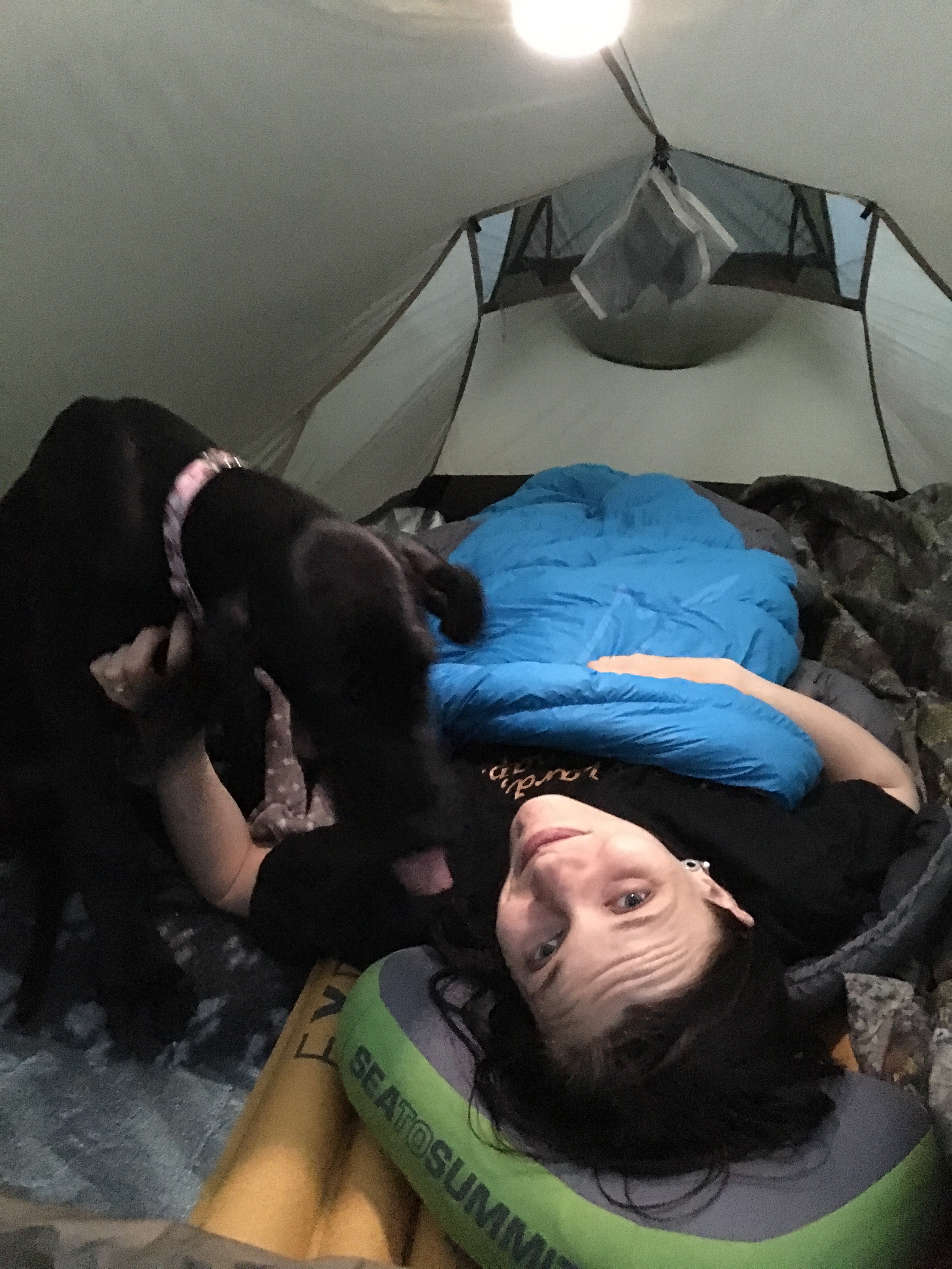 Nemi otti teltan haltuun kuin vanha tekijä. Oma peti tunnistettiin välittömästi, ja Nemille ominaiseen tyyliin ylimääräiset pyörimiset ja härvääminen jäi minimiin: pedille kierähdettiin maaten, ja siihen sitä sitten jäätiin. Suuri onni oli, kun Nemi sai nukkua ihan Oman Äitin vieressä; milloin oli kasvot kiinni omissani, milloin vain tassu kosketti kättäni. <3
