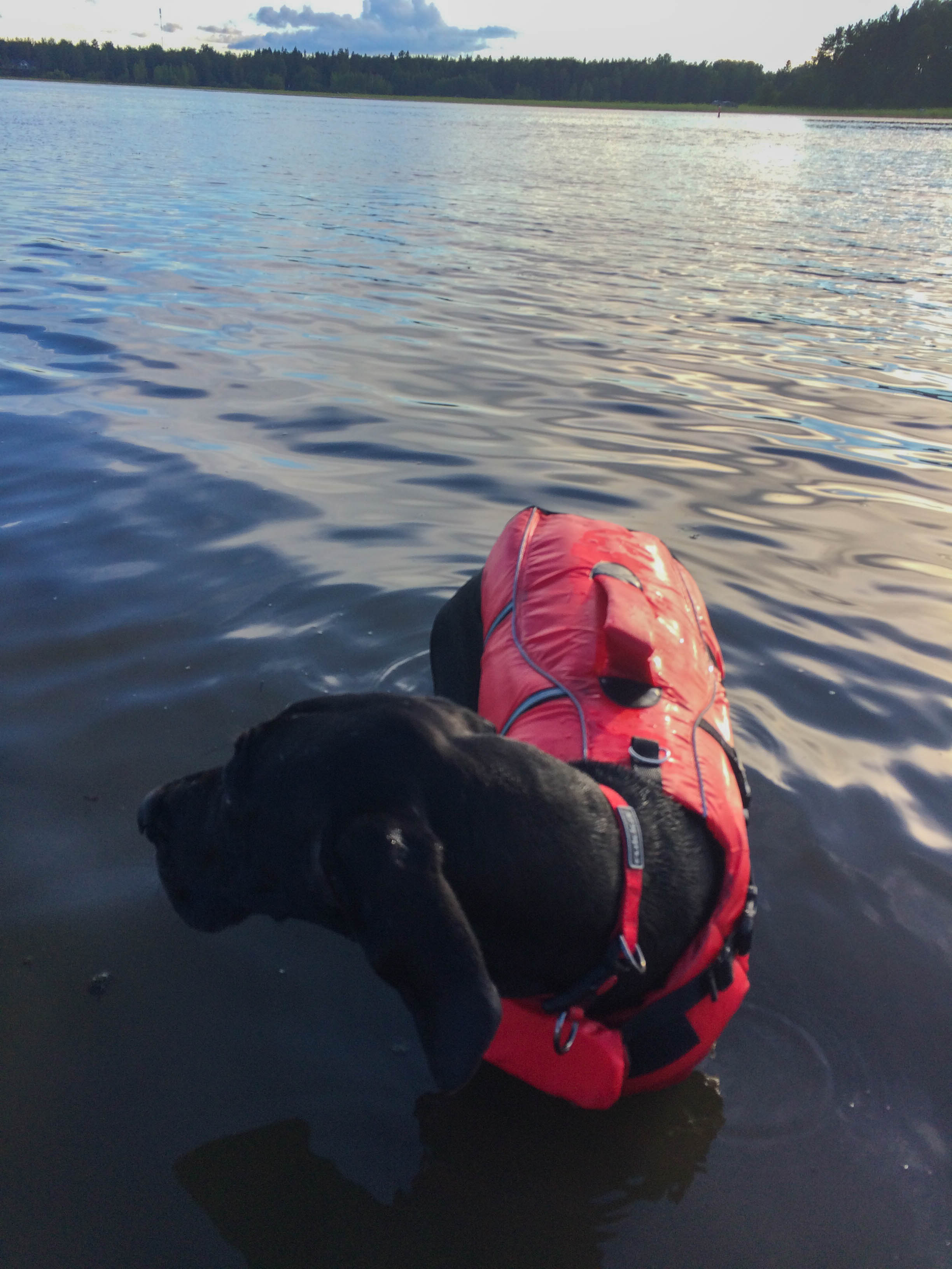 Kävimme Nemin kanssa viikonloppuna myös uimassa. Luontaisena vilukissana minulla ei ollut aiemmin käynyt edes mielessäni se vaihtoehto, että koirauimalan tasaisen- ja sopivanlämpöisen ilmaston lisäksi olisi olemassa vaihtoehto ja mahdollisuus käydä uimassa luonnonvesissä! Uinti tosiaankin viilentäisi koiran niveliä ja olisi erittäin nivelystävällistä ja tehokasta liikuntaa. Ja kun minulla muutenkin on ajatuksissa saada tuosta aikaan uiva koira, niin minä päätin: opetellaan ja harjoitellaan se homma sitten nyt. Eli ei muuta kuin sopivan kokoista pelastusliiviä ylle ja uimaan.