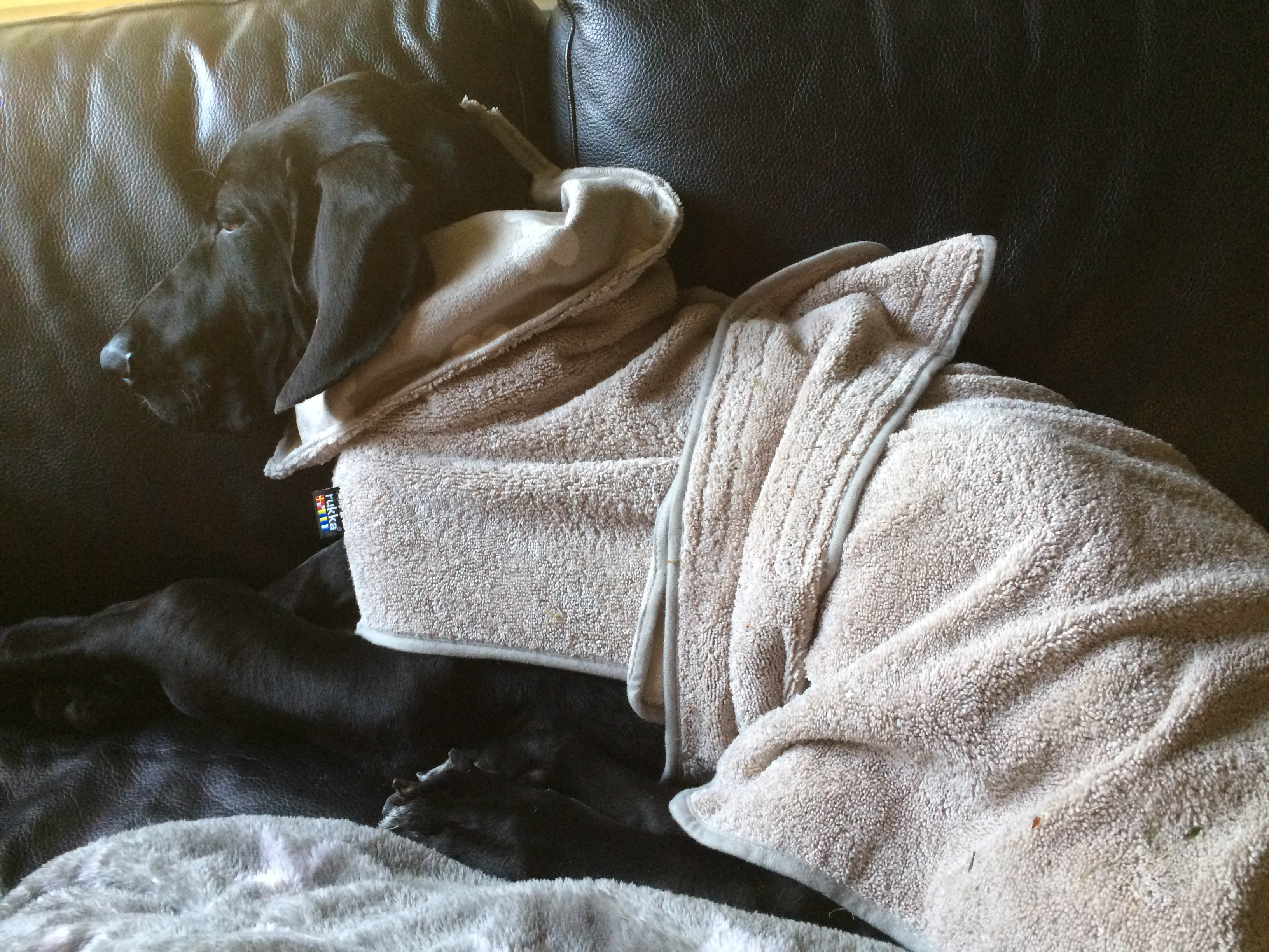 Kunnon spa-meininkiä; kuivattelussa / lämmittelyssä käytössä koiran oma kylpypyyhe – mutta on meinaan näppärä!