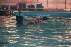 Toiselta uintikierrokselta alkaen Niinan koirat saatiin rytmitettyä hienosti Nemin uintiin niin, että menomatka mentiin Mimmin imussa ja takaisin päin tultiin tasaisen rauhallisesti polskuttavan Pennin kyljessä. Uskon, että varman rauhalliset ystävät toivat tukea ja kannustusta Nemille. Ja vaikka Nemi kauhisteli joka kerta, kun sitä alettiin viedä kohti veteen laskeutuvaa ramppia, veteen päästyään se kuitenkin liikkui kohtalaisen rauhallisesti – ja kierros kierrokselta paremmin!