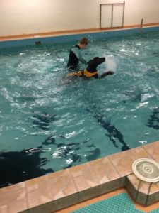 Koirilla on uidessaan hassu ja suloinen tapa yrittää vältellä naamansa kastumista siten, että pää nostetaan mahdollisimman korkealle ilmaan. Tämä aiheuttaa aina ja väistämättä sen, että myös etutassut nousevat ylöspäin ja loiskivat pintavettä, aiheuttaen paitsi koiran itsensä, mutta kaiken muunkin kastumisen viiden metrin säteellä. Tällä kertaa Nemin uintiasento oli niiiiiin korkealla, että vesiroiskeet taisivat osua kattoon asti! Tuovilla oli tähän ihan mainio korjausliike: Nemille puettiin päälle toisetkin pelastusliivit, ja tällä saatiin koiralle ekstratukea. Näillä tuilla koira kuulemma kelluisi kuin korkki, ja toisi turvallisuuden tunnetta uimiseen.
