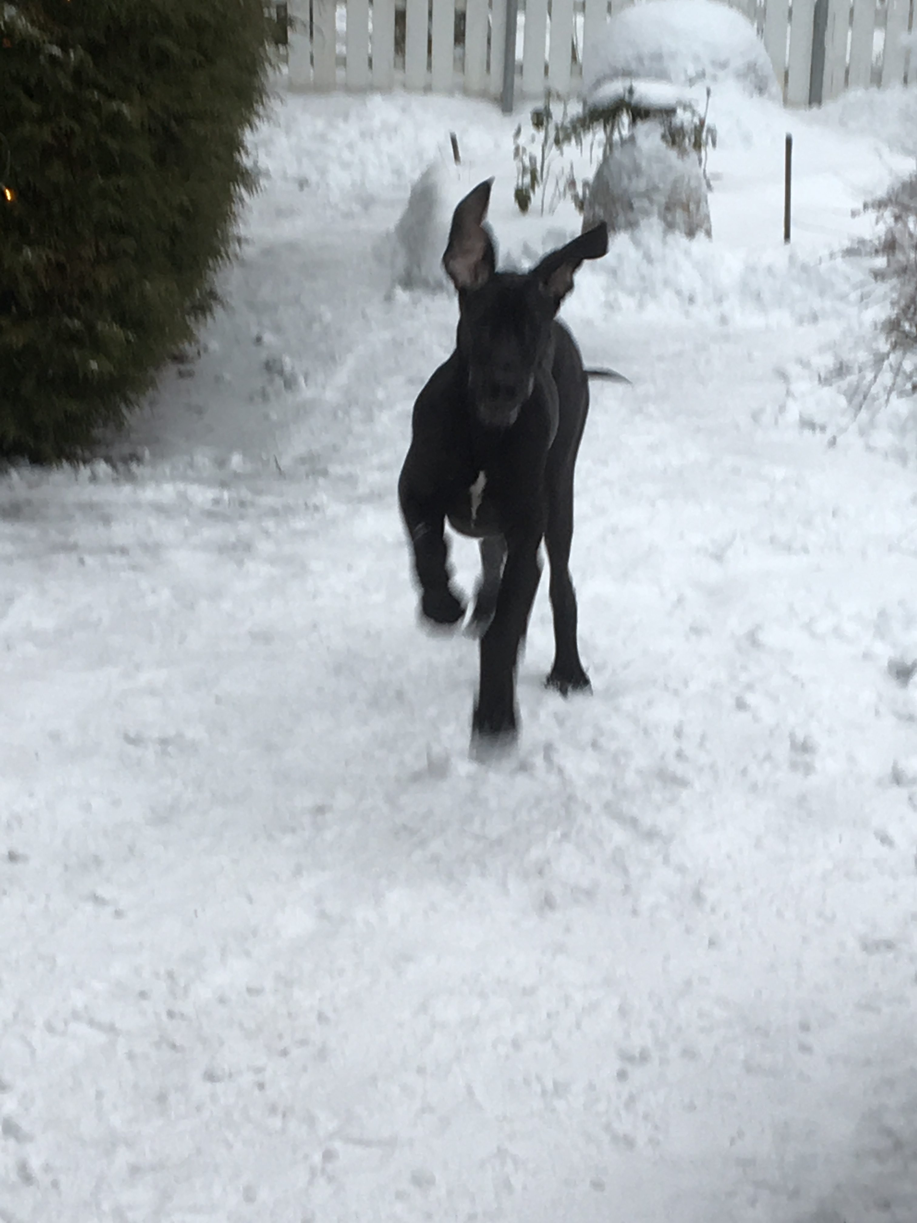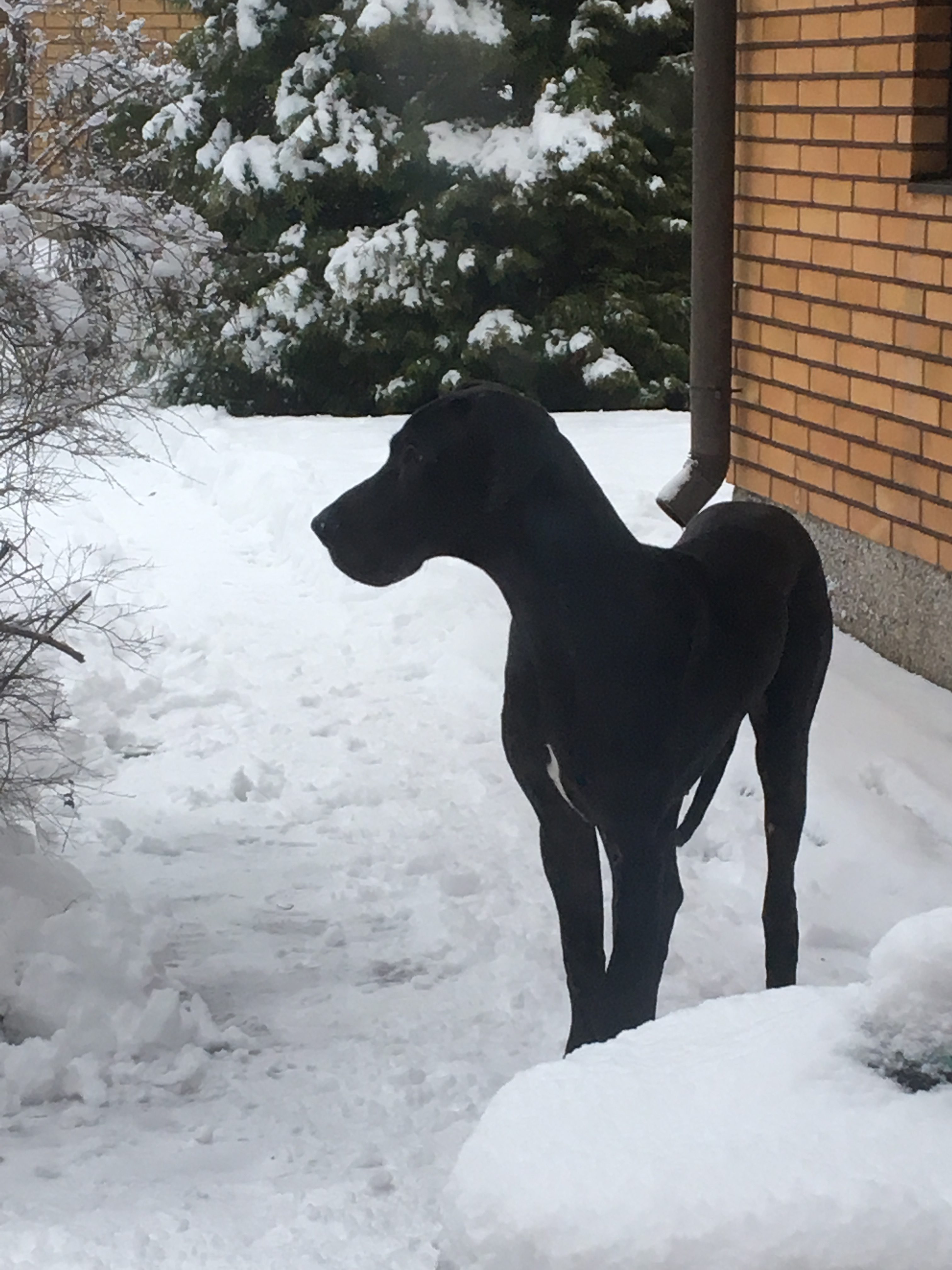 Joulupäivänä suuntasimme auton nokan maalle ja menimme tapaamaan Nemin Mamia ja Pappaa. Myös siskoni perheineen oli paikalla, ja näin ollen Nemi pääsi tapaamaan pitkästä aikaa siskontyttöjäkin! Jouluneule hurmasi kaikki, ja ihmettelyä riitti siitä, että koira on kasvanut taas paljon edellisnäkemiseltä. Joulupäiviä saatiin viettää lumisemmissa maisemissa kuin kotipuolessa, ja Nemihän nautti hankirallista – jälleen kerran, – täysin siemauksin.