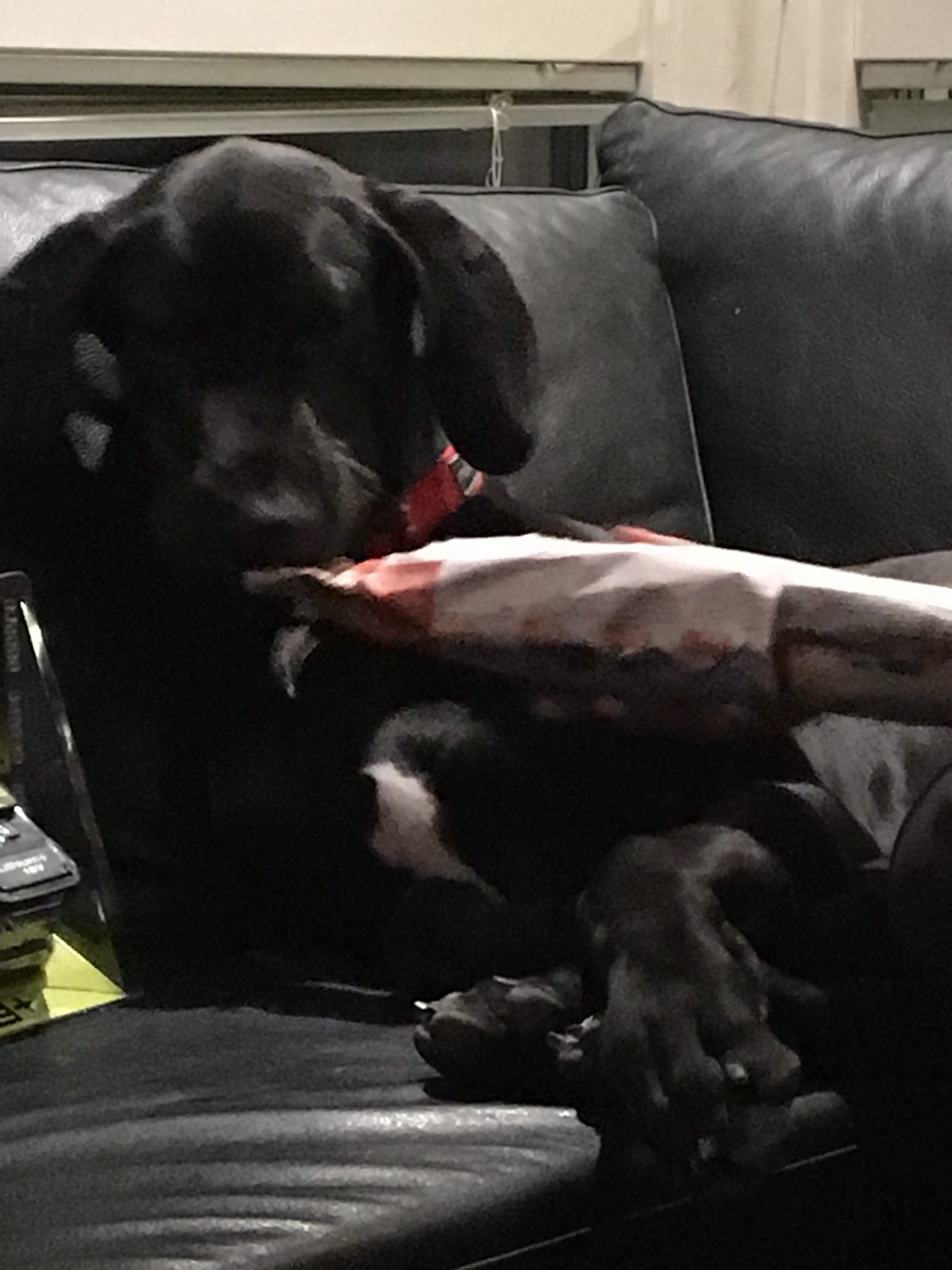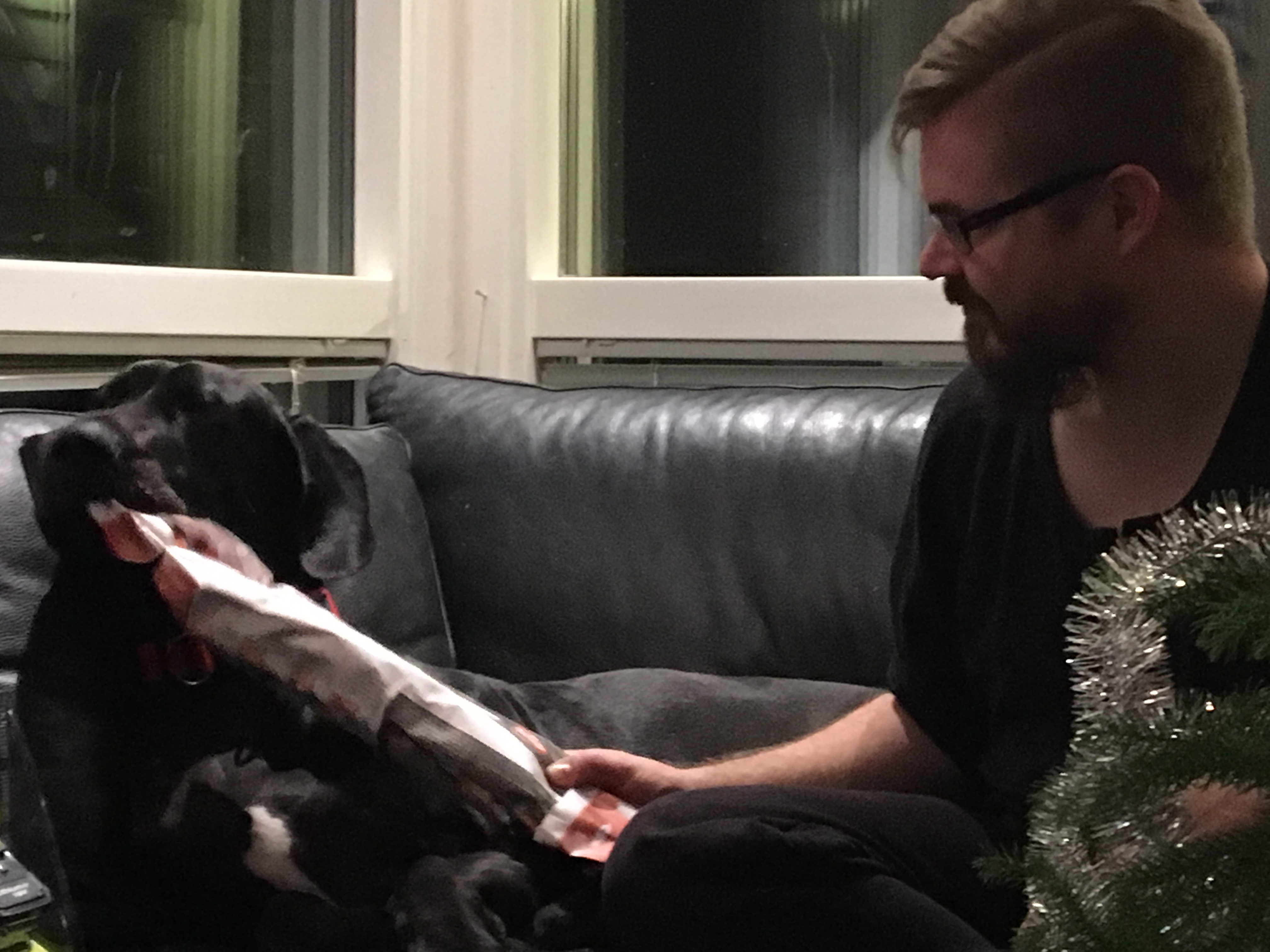 Aattopäivää ja -iltaa vietettiin kotona oman perheen sekä Mummin ja Ukin kanssa. Illalla Nemikin sai huomata olleensa tänä vuonna kiltti, kun joulupukki toi kuin toikin lahjoja *)! Nemi sai ihan itse avata oman pakettinsa: revittyään paperista kulman auki, se keskittyneesti kiskoi nyytistä ulos lelun, jota se alkoi onnellisena heti natustaa. Myöhemmin vielä toisesta paketista tuli esiin puruluu ja hassusti käkättävä pallo, mutta ensimmäinen lelu muodostui sen päivän suosikiksi.