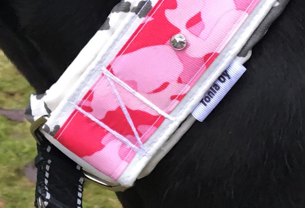 Kyseessä on Tonia Designin pehmustettu puolikiristävä Sweet Soldier heavy -panta, jossa on käytetty M05-lumimaastokuviokangasta, vähän pinkkiä camoa ja tietenkin vähän bling-blingiä. Pehmustemateriaali on lisäksi jotain lämpöä tasaavaa, ja kun tämä on tosiaan vielä mittatilaustyönä tehty ja suomalaista käsityötä, niin avot. Panta on aivan superhieno, Kiitos! <3