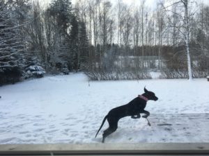 Tänään sitten päästiin viimein lähtemään metsään. Voi että pieneläin nautti! Se nuuskutteli lumesta löytyviä jälkiä, kiipesi kivillä ja kannoilla ja spurttaili lumen alle kätkeytyneiden sammalikkojen keskellä. Metsässä oltiin noin kolme varttia, mutta kotiin päästyämme Nemi suuntasi suoraan takapihalle. Okei, sen kun menee vielä jatkamaan juoksemista. Neiti painatti pihalla yksinään täysiä vielä noin vartin verran, ennen kuin oli ilmeisesti saanut juosta tarpeekseen. 🙂