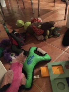 Ja sitten kun vielä eilen minä olin ns. “pelistä pois” vatsataudin vuoksi, tarjoilin koiralle puuhaa aktivointipelin muodossa. Voi sitä nuuskutuksen määrää, kun pienen koira nenä kertoi, että lelussa on vielä nameja jäljellä…! Peli on hyvä keino saada koiran pääkoppaa väsytettyä, jos fyysinen väsytys ei syystä toisesta ole mahdollista.