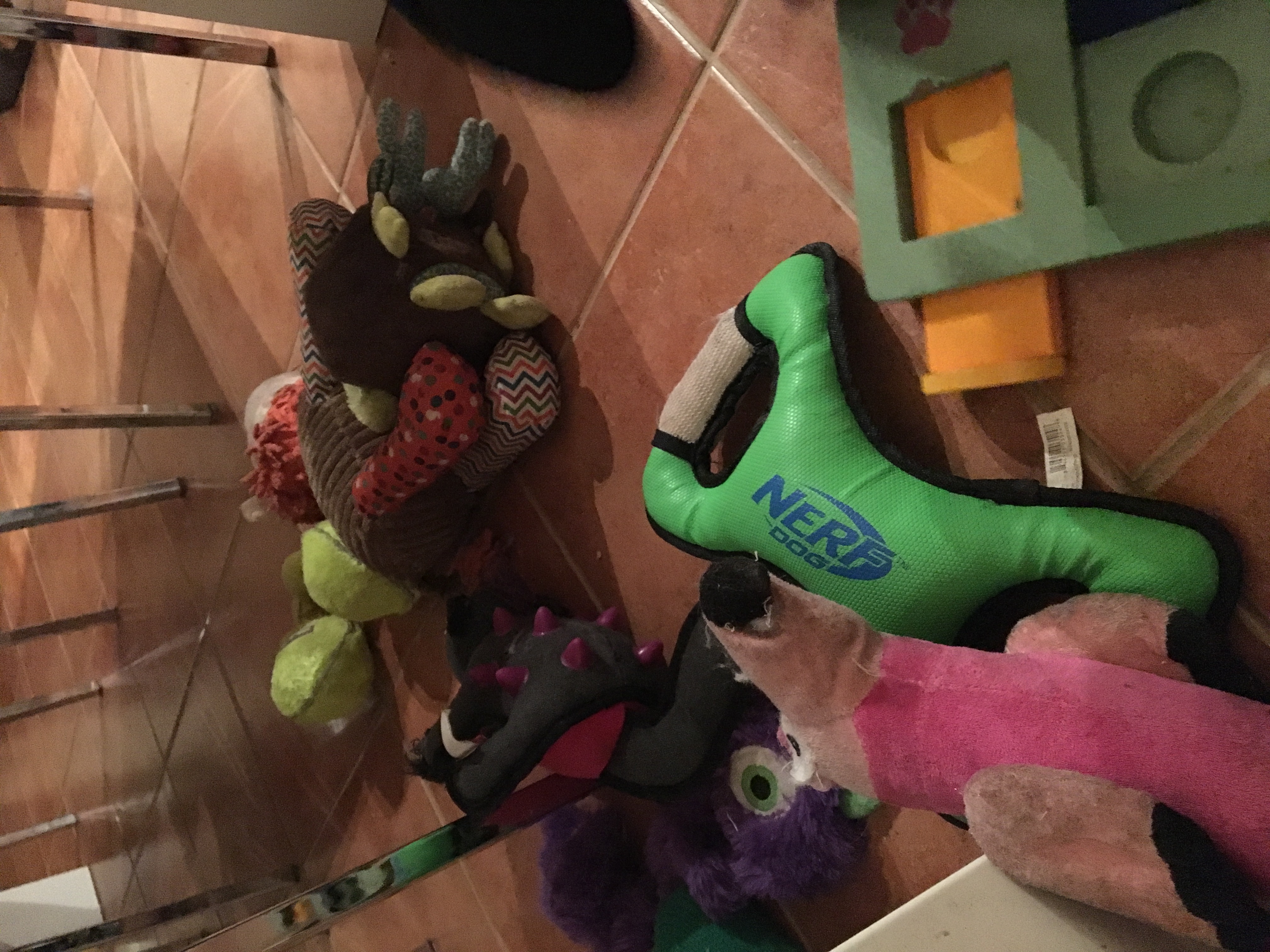 Nylabone maistuu. Seuraavaksi alan opettaa koiralle, että se paitsi hakee lelut lelukopasta, mutta osaisi viedä niitä myös takaisin…