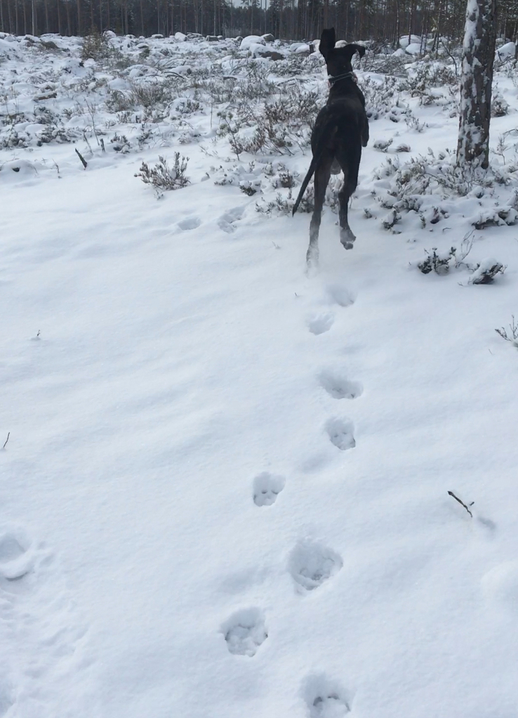Tänään sitten päästiin viimein lähtemään metsään. Voi että pieneläin nautti! Se nuuskutteli lumesta löytyviä jälkiä, kiipesi kivillä ja kannoilla ja spurttaili lumen alle kätkeytyneiden sammalikkojen keskellä. Metsässä oltiin noin kolme varttia, mutta kotiin päästyämme Nemi suuntasi suoraan takapihalle. Okei, sen kun menee vielä jatkamaan juoksemista. Neiti painatti pihalla yksinään täysiä vielä noin vartin verran, ennen kuin oli ilmeisesti saanut juosta tarpeekseen. 🙂