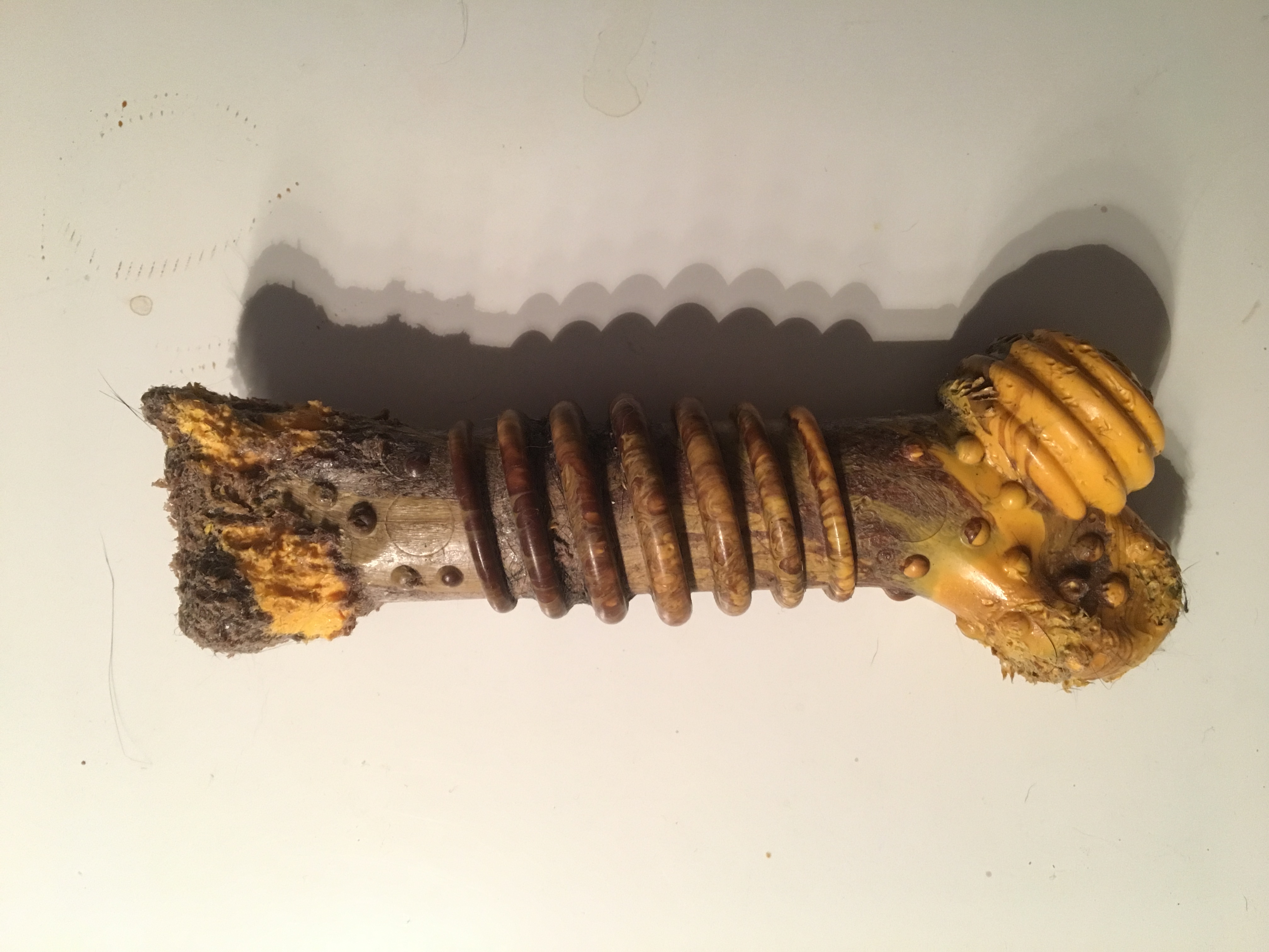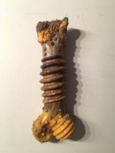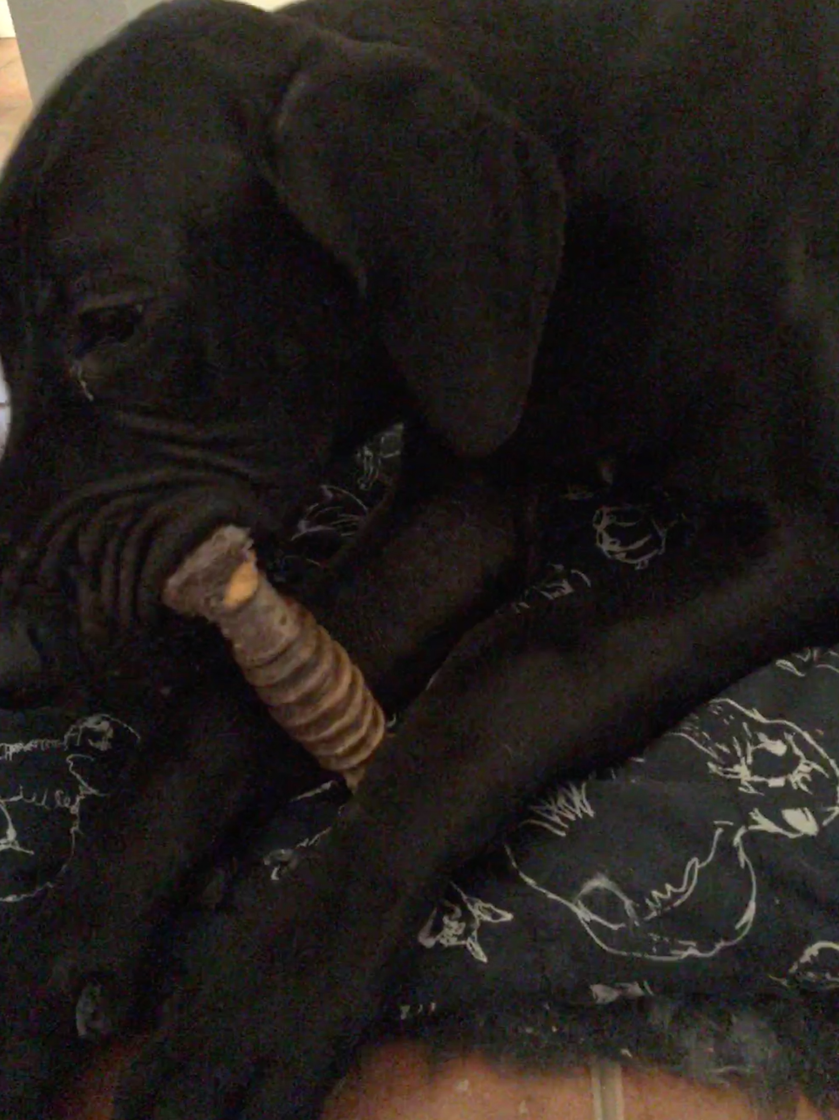 Meillä syödään myös paljon luita. Ihan perinteiset nahkaluut on viime aikoina korvannut tämä Nylabone-lelu, voin erittäin lämpimästi suositella! Nylabonet on valmistettu kestävästä ja maustetusta nailonista, eli makua vapautuu joka kerta koiran syödessä lelua. Tätä luuta meillä on syöty nyt joulukuun alusta, eli 1,5 kuukautta, joka ikinen päivä huolella ja hartaasti, ja lelusta on kulunut vasta noin vähän! Tämä oli todella hyvä hankinta! Leluilla leikkiminen ja luiden syöminen on ollut Nemille erittäin hyvää ajanvietettä; pureskeltavan parissa se viihtyy vaikka kuinka kauan.