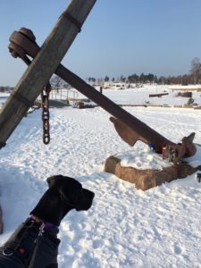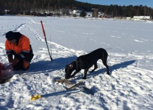 Verkkoja kokemassa oli useampi alaan vihkiytynyt herrasmies, ja eri toimintojen vuoksi heitä seisoi verkkojen molemmissa päissä avannon ja tai kairatun reiän luona. No, Nemillä oli valtava työ itsehillintänsä kanssa: sen sen olisi tehnyt aivan suunnattomasti mieli lähteä kiitolaukkajuoksemaan jokaisen ihmisen luo. Minä en voinut tätä sallia, koska a) en tuntenut kaikkia paikalla olleita; joku olis saattanut pelästyä täysillä kohti juoksevaa, hullun kiilto silmissään laukkaavaa, vaahtokuolaa erittävää metrin korkuista mustaa koiraa, b) Nemi olisi kuitenkin onnistunut putoamaan avantoon, sotkeutumaan verkkoon tai tekemään jotain muuta yhtä ei-toivottavaa. Niinpä tämä otettiin harjoituksen kannalta: kuinka lähellä voidaan olla kiinnostavaa kohdetta niin, että Nemi yhä palaa luokseni sen sijaan, että irtoaisi ja menisi vielä kiinnostavamman kohteen luo? Harjoitus sujui meiltä oikein hienosti: vaikka koira teppasi paikallaan tai muutaman metrin minusta edellä, rauhallinen pyyntö palata luokseni toimi joka kerta. Namin syötyään Nemi muisti TAAS sen Tuolla Olevan Jännän Tyypin ja kihisi paikallaan korvat hörössä: eikö sais jo mennä! Muutaman metrin se saattoi irrota minusta kohti kohdetta, ja kuitenkin taas pyyntö palata takaisin toimi. Olin tosi tyytyväinen. Hieno tyttö 🙂 <3