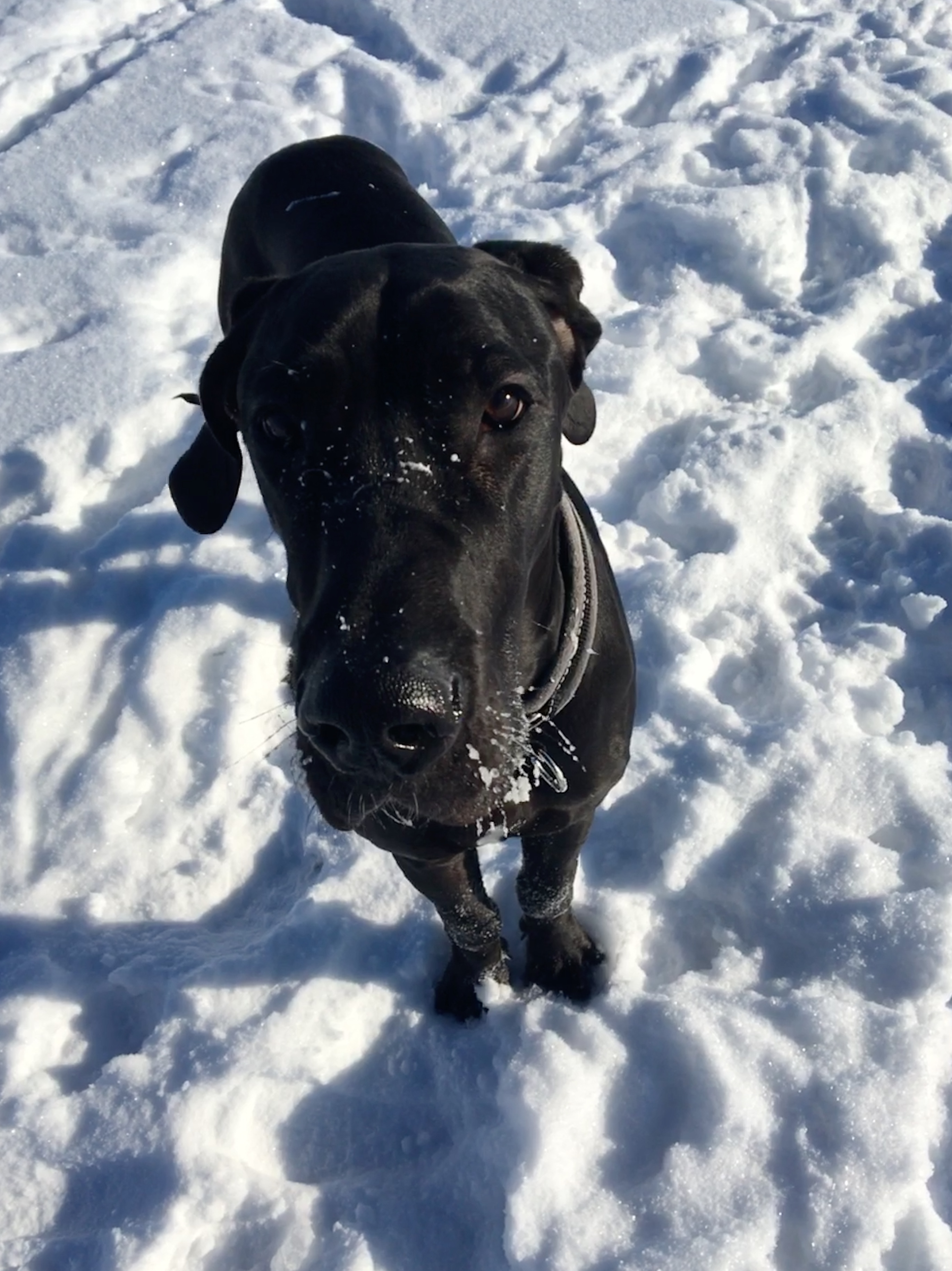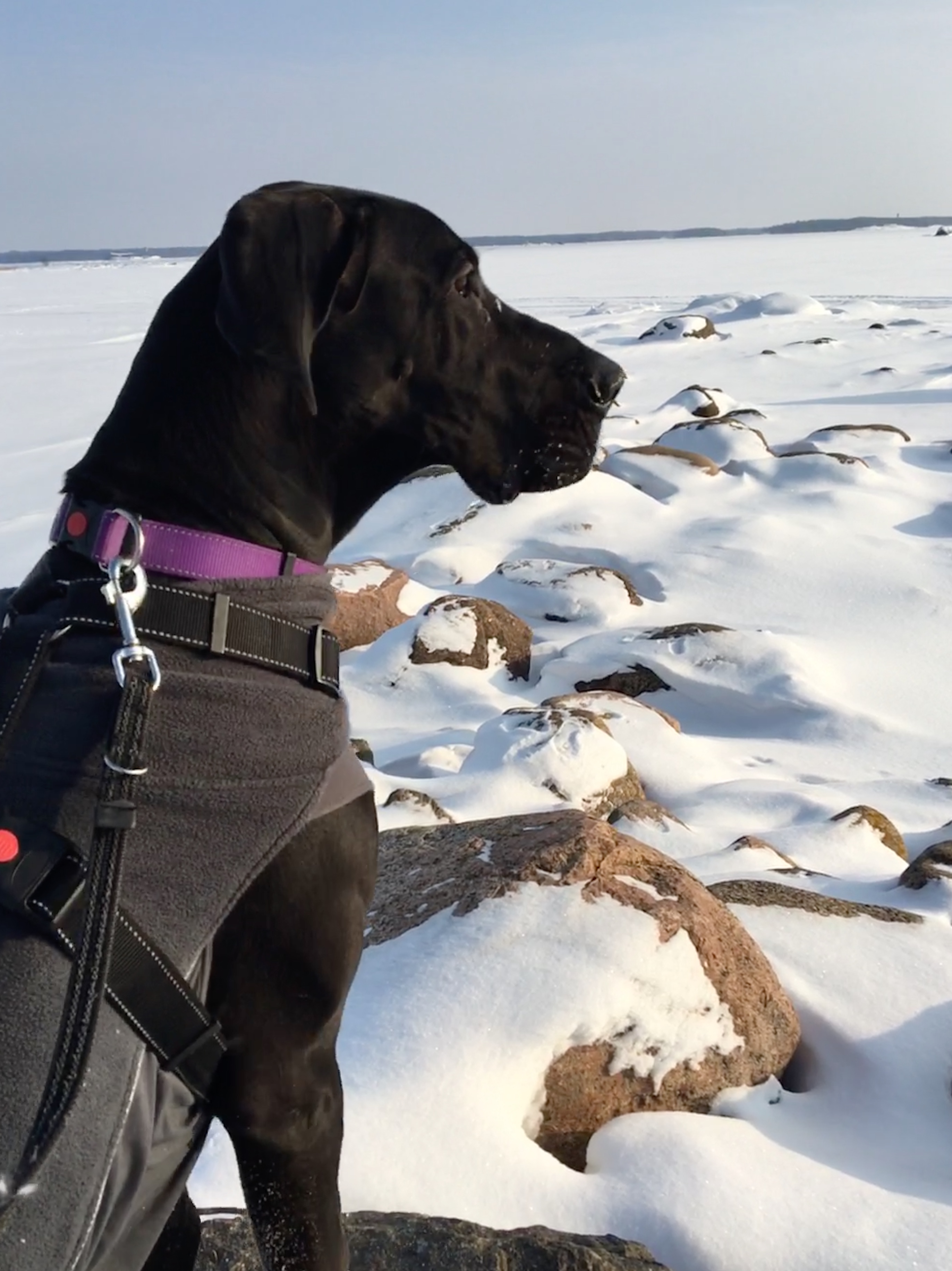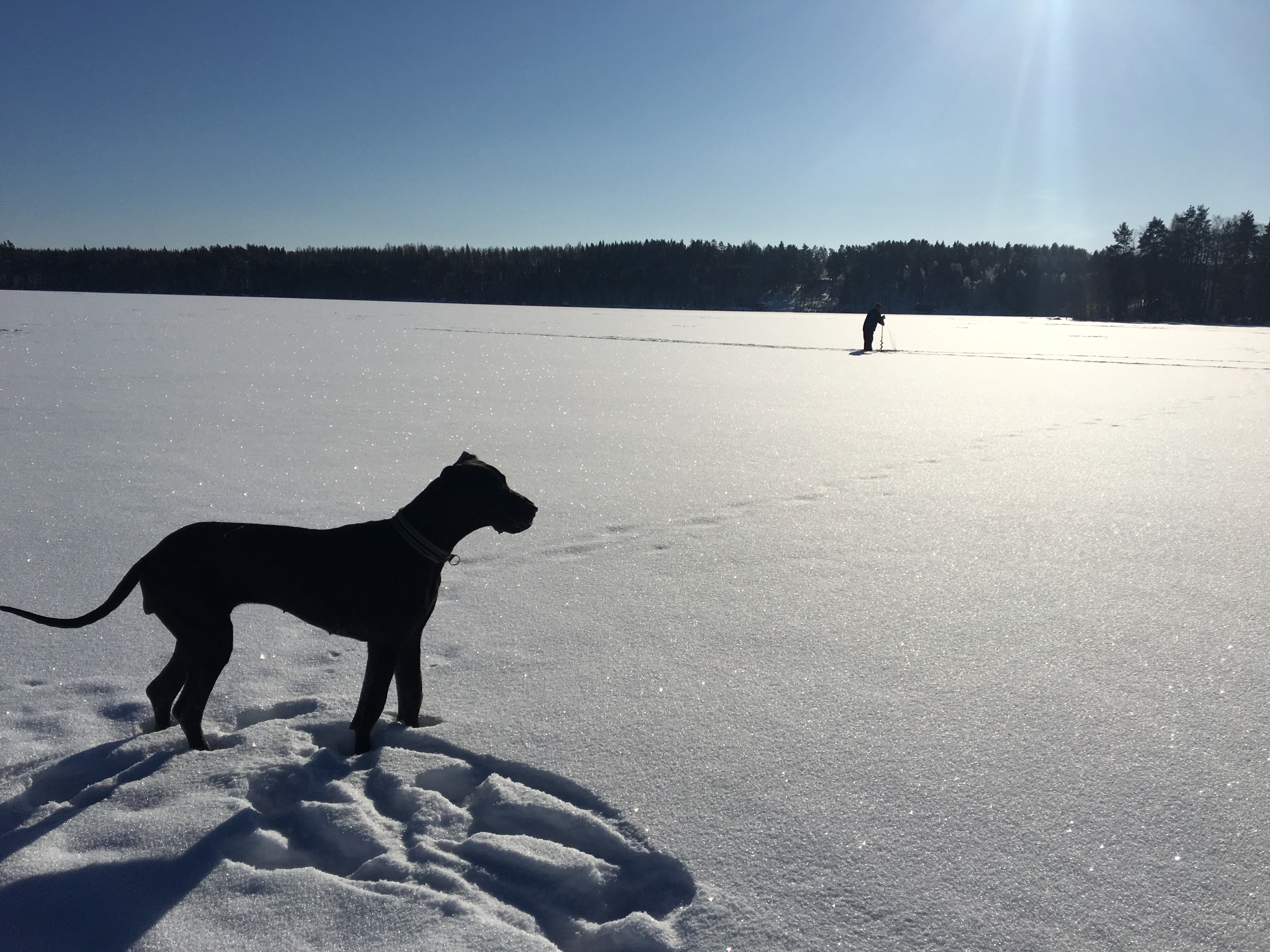 Verkkoja kokemassa oli useampi alaan vihkiytynyt herrasmies, ja eri toimintojen vuoksi heitä seisoi verkkojen molemmissa päissä avannon ja tai kairatun reiän luona. No, Nemillä oli valtava työ itsehillintänsä kanssa: sen sen olisi tehnyt aivan suunnattomasti mieli lähteä kiitolaukkajuoksemaan jokaisen ihmisen luo. Minä en voinut tätä sallia, koska a) en tuntenut kaikkia paikalla olleita; joku olis saattanut pelästyä täysillä kohti juoksevaa, hullun kiilto silmissään laukkaavaa, vaahtokuolaa erittävää metrin korkuista mustaa koiraa, b) Nemi olisi kuitenkin onnistunut putoamaan avantoon, sotkeutumaan verkkoon tai tekemään jotain muuta yhtä ei-toivottavaa. Niinpä tämä otettiin harjoituksen kannalta: kuinka lähellä voidaan olla kiinnostavaa kohdetta niin, että Nemi yhä palaa luokseni sen sijaan, että irtoaisi ja menisi vielä kiinnostavamman kohteen luo? Harjoitus sujui meiltä oikein hienosti: vaikka koira teppasi paikallaan tai muutaman metrin minusta edellä, rauhallinen pyyntö palata luokseni toimi joka kerta. Namin syötyään Nemi muisti TAAS sen Tuolla Olevan Jännän Tyypin ja kihisi paikallaan korvat hörössä: eikö sais jo mennä! Muutaman metrin se saattoi irrota minusta kohti kohdetta, ja kuitenkin taas pyyntö palata takaisin toimi. Olin tosi tyytyväinen. Hieno tyttö 🙂 <3