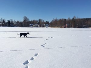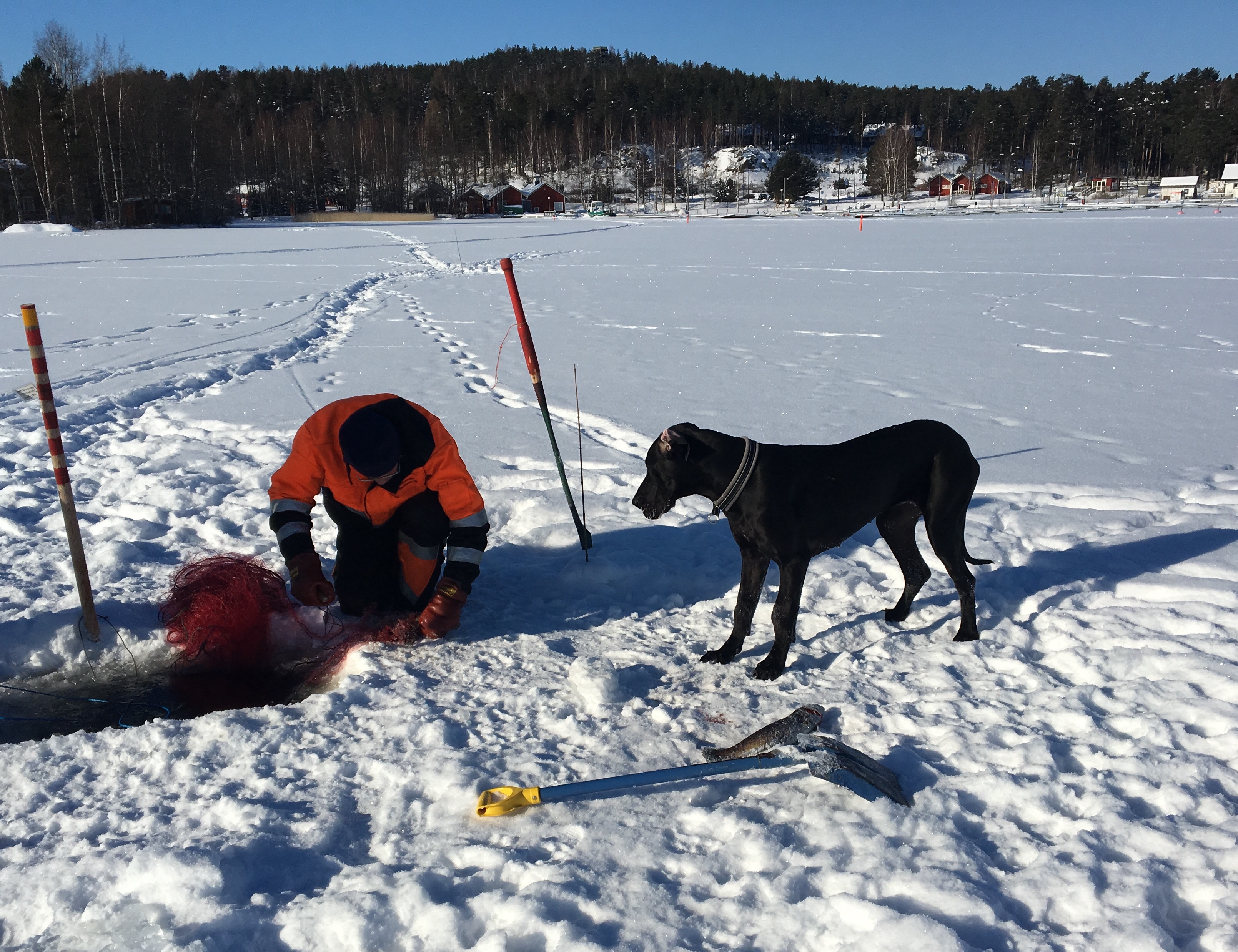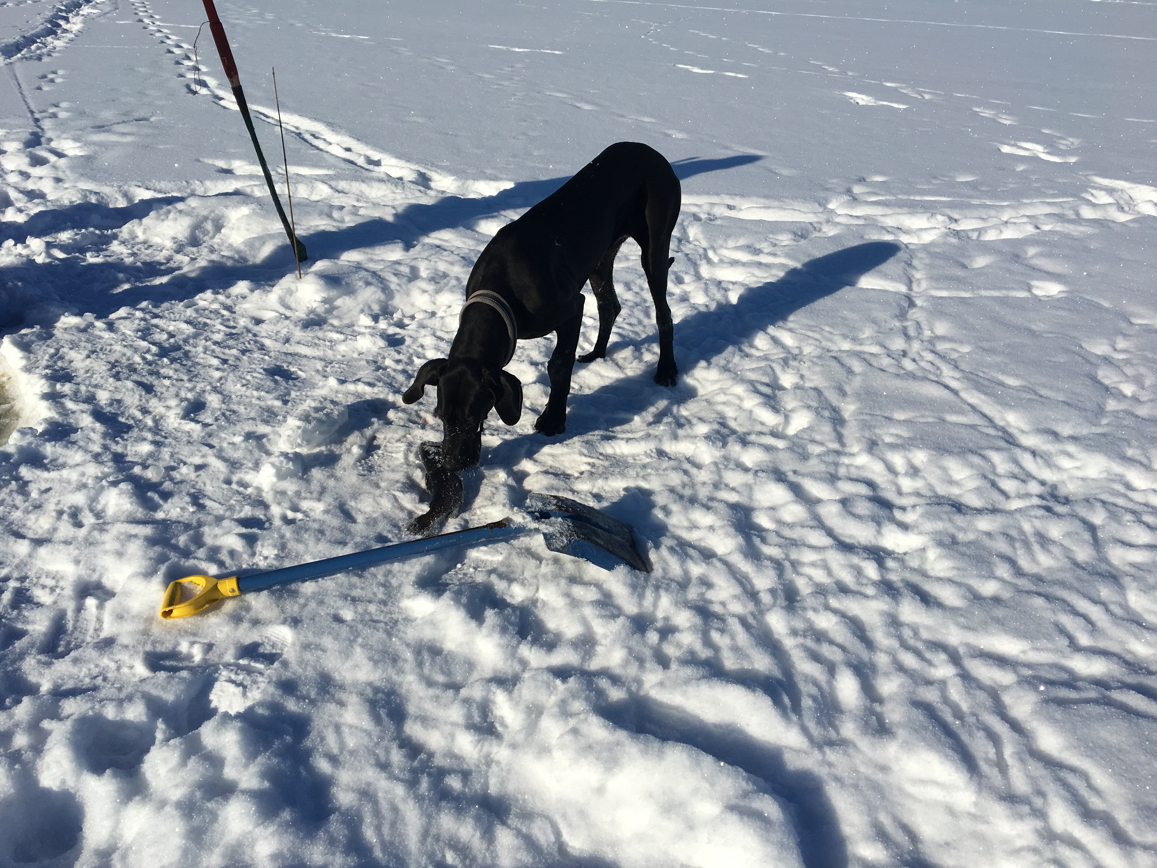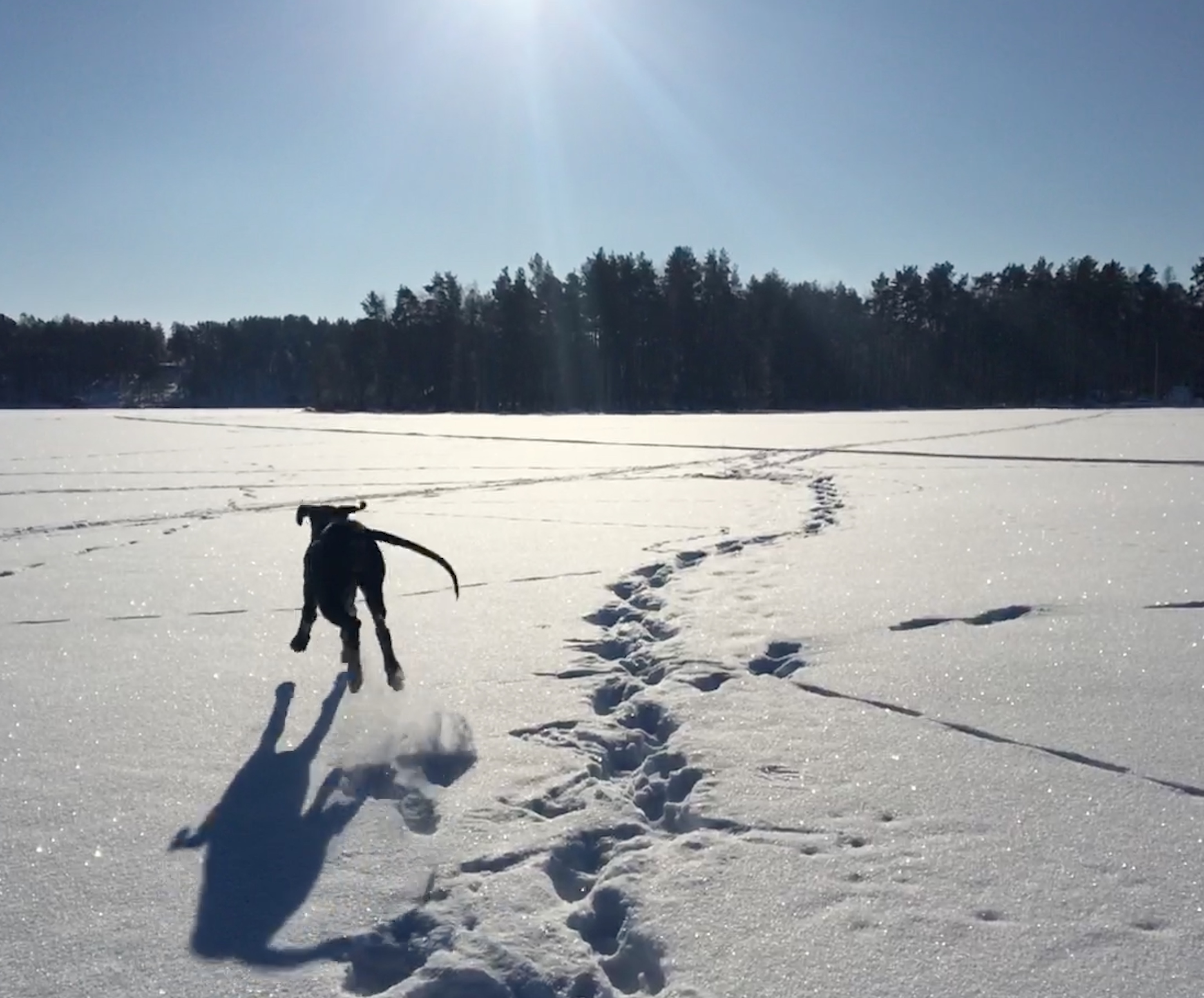 Sitten, viikkoa myöhemmin päästiin viettämään vapaata viikonloppua maalle Nemin Mummin ja Papan luo. Lauantain ohjelmassa oli verkkojen kokemista jäällä, Nemi oli tietenkin nyt ensimmäistä kertaa mukana, ja minun piti aika tarkkaan vahtia tyyppiä, ettei se putoa avantoon, potki kairaa, sotkeudu jäällä oleviin naruihin tai – mikä huvittavinta, – varasta kalansaalista! Kyllä, näppärän kokoinen kirjolohi meinasi tarttua evästään Nemin etuhampaisiin useammankin kerran.