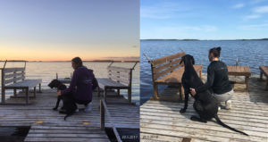 Ja hyvinkin hassulla sattumalla tulin huomanneeksi, että juuri tänään, 20.5. on kulunut päivälleen vuosi siitä, kun Nemi tuotiin mökille ensimmäistä kertaa elämässään, tuolloin 13 viikkoa vanhana vauvana. Siitä illasta on olemassa ihana yhteiskuva. Nyt oli pakko saada ottaa kuva “nyt ja silloin” -kuva…