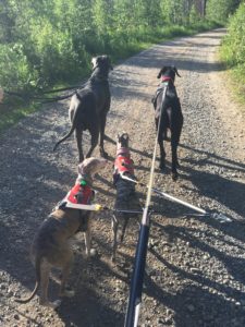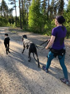 Koirat kävelivät kuumuudesta huolimatta (tai juuri siksi) erittäin nätisti. Vaikka neljästä koirasta kolme oli erittäin nuoria, ei kävely aiheuttanut mitään riehumiskohtauksia tai hepulointihaluja. Nemi taivalsi kanssani hienosti riippumatta siitä, käveltiinkö me ekana, viimeisenä tai jossain muiden koirien keskellä – ei mitään hihnassakiskomisia, sinkoamisia toisten luo tai muutakaan kummallista. Se käveli niin hienosti!! <3 Kaikki koirat kävelivät! Kokeilinpa jonkun matkan myös taluttaa Hemppaa samalla, kun Nemi kulki talutusvyössä. Sekin meni hienosti!