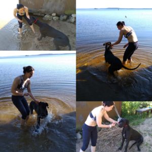 Sitä ennen oli kuitenkin vähän aikaa nauttia mökkeilyn iloista, kuten vesien kantamisesta, saunomisesta, ihanasta auringonpaisteesta ja pienen koiranpennun rääkkäämisestä uintihommilla… Mökkiranta on aivan upea: matala, kirkasvetinen ja pohjana on sileää hiekkaa. Kun vielä sattui tyyni aamupäivä, oli se Nemi pakko saada kokeilemaan järvivettä… Nemi oli kanssani eri mieltä. Mutta Nemiltä ei nyt kysytty. 🙂 Tällä kertaa kastauduttiin polviin asti, katsellaan sitten seuraavalla kerralla, jos mentäisiin jo vähän syvemmällekin (kunhan myös koiran pelastusliivit tulevat mukaan).
