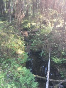 Veikkaan, että siinä kuumuudessa ei metsään ollut eksynyt päivän aikana yhden ainutta muuta elävää olentoa ja NE, eli hyttyset kiljuivat riemusta, kun päivän ateria vihdoin saapui paikalle. Voin oikein kuulla hyttysten riemuhuudot: ”Wohoo! Neljä ihmistä ja – kelatkaa – neljä koiraa! Mässäilybileet pystyyn!!” Lentävät hyeenat ympäröivät meidät välittömästi, kun nousimme autosta. Hyttyskarkote loitonsi pikkuvampyyrejä hetkeksi, ehkä noin kymmeneksi minuutiksi, ennen kuin seuraava komppania uskaliaasti kävi kimppuumme. Silti, me lähdimme taivaltamaan. Olihan sitä jo tänne asti tultu, perhana. Rinkat jäivät autoon ja mukaan pakattiin vettä, energiapatukat ja hyttyskarkote.