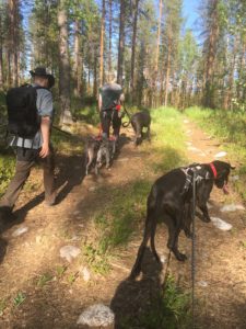 Kävely oli, verenimijöistä huolimatta, mukavaa ja leppoisaa. Jossain kohtaa huomasimme, että olimme tulleet valinneeksi vielä sen vähän pidemmän reitin – no, ei se mitään, tässähän tämä menee kulkiessa ja mukavia höpötellessä! Paljon ei pysähdelty taukoja pitämään tai maisemia ihmettelemään; muutaman kerran oli pakko, jotta saatiin koiria juotettua.