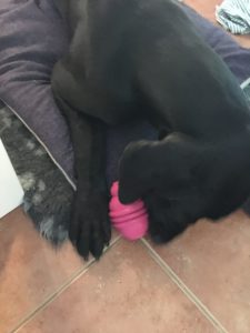 Pääkoppaa on tyhjennetty esimerkiksi täyttämällä kuminen lelu märkäruoalla ja pakastamalla koko setti jäiseksi möhkäleeksi. Tällaisen kanssa Nemi puuhailee helposti tunnin. On muuten toimiva konsepti, varsinkin kun päivät ovat olleet kovin lämpöisiä viime aikoina!
