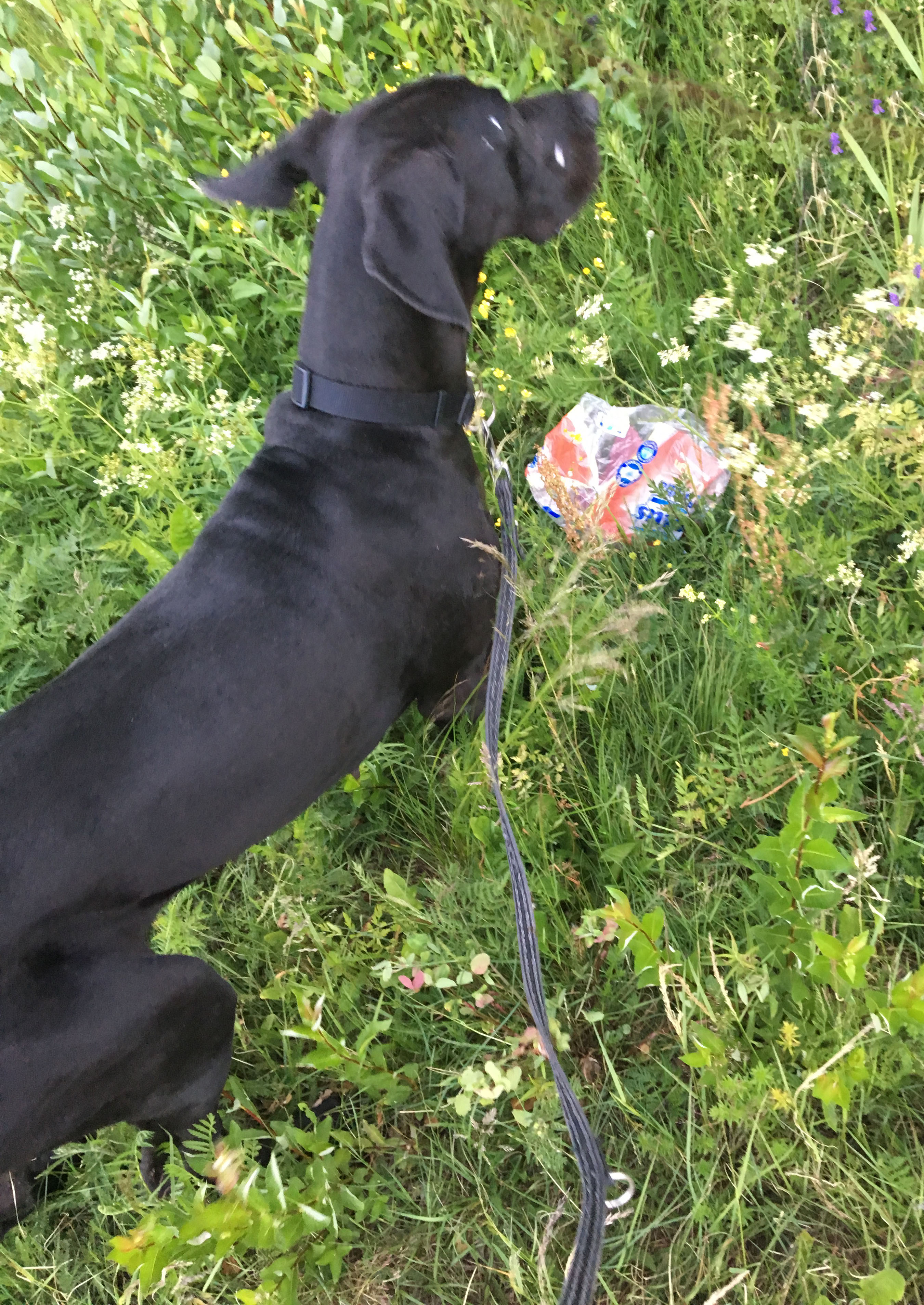 Hihnalenkkejä on yritetty tehdä varovaisesti. Valmiiksi korkeat kierrosluvut tuovat tähänkin vähän omaa maustettaan 😉 Onneksi Nemi-rakas on ihanan perusrauhallinen tapaus, mutta onhan se nyt ihan mahdotonta kun lenkillä ohitettiin muutamilla pihoilla Ihmisiä!! “Äiti näätkö, tuolla on ihminen! Kato! Kato!” .. Ja kun näistä melkein jo selvittiin, oli yhdellä pihalla Jotain Kamalaa! Sitä pysähdyttiin seisomaan – siis pointterityyliin, yksi etujalka ilmassa, korvat tötteröllä katseen hievahtamatta. Minä sitten selittämään: “Kyllä, Nemi-rakas, se on pyykkiteline, ja siinä roikkuu jonkun pyykkejä!” … Mutta kaikista pahin ja suurin esteistä ja haasteista oli jätetty ihan meidän kotipihan lähelle, tien viereen ojaan vaanimaan lenkiltä palaavaa pientä koiranpentua.
