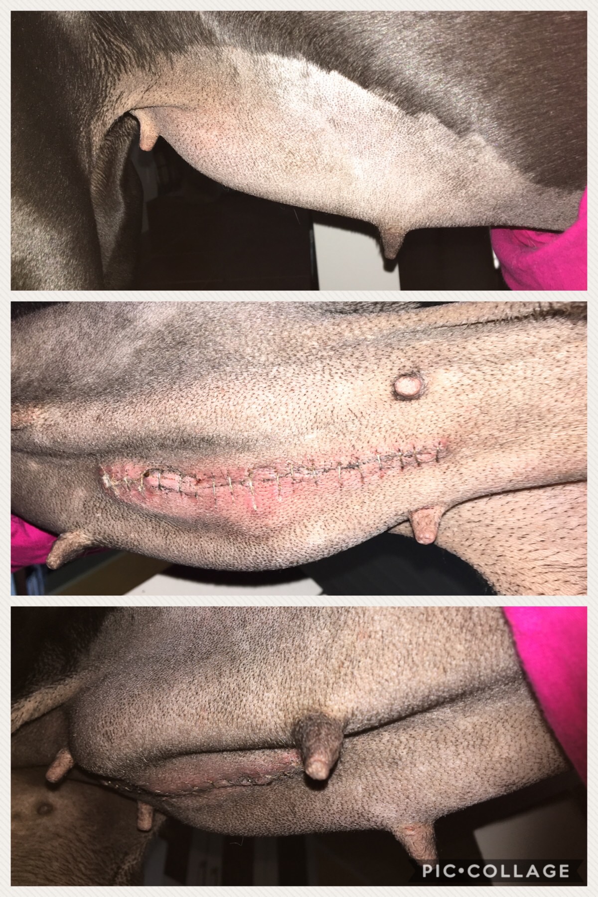 Ja niinhän siellä haavassa oli sitten kunnon reikä, eli revennyt tikki (mahdollisesti useampi? Tästä en ole ihan varma). Keskusteltuamme vaihtoehdoista päädyttiin operoimaan kohta uudestaan ja tarkistamaan samalla, ettei sisällä ole alkavia tulehduksia (ei ollut, onneksi!). Iltapäivällä hain kotiin tokkuraisen koiran, jolla oli nyt 19 tikin sijasta 24 uutta tikkiä mahassaan.