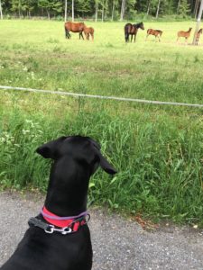 Jos mökkeillessä kerran joutuu lähtemään hihnalenkille, on siinä yksi hyvä juttu: nimittäin lenkin varrella pääsee ihmettelemään hevosia, ja näin alkukesästä myös pieniä varsoja. <3 Nemillä oli taas jännää!