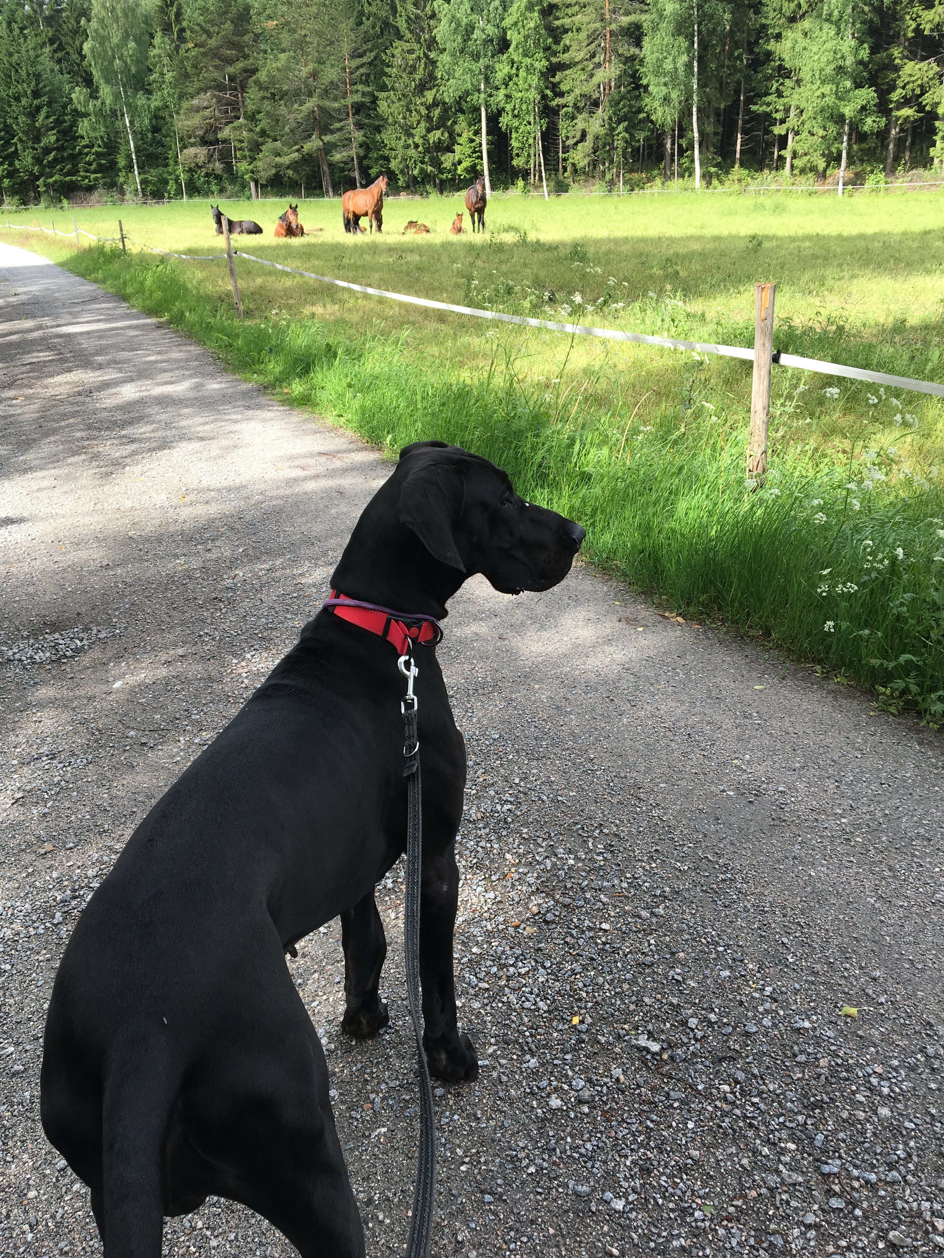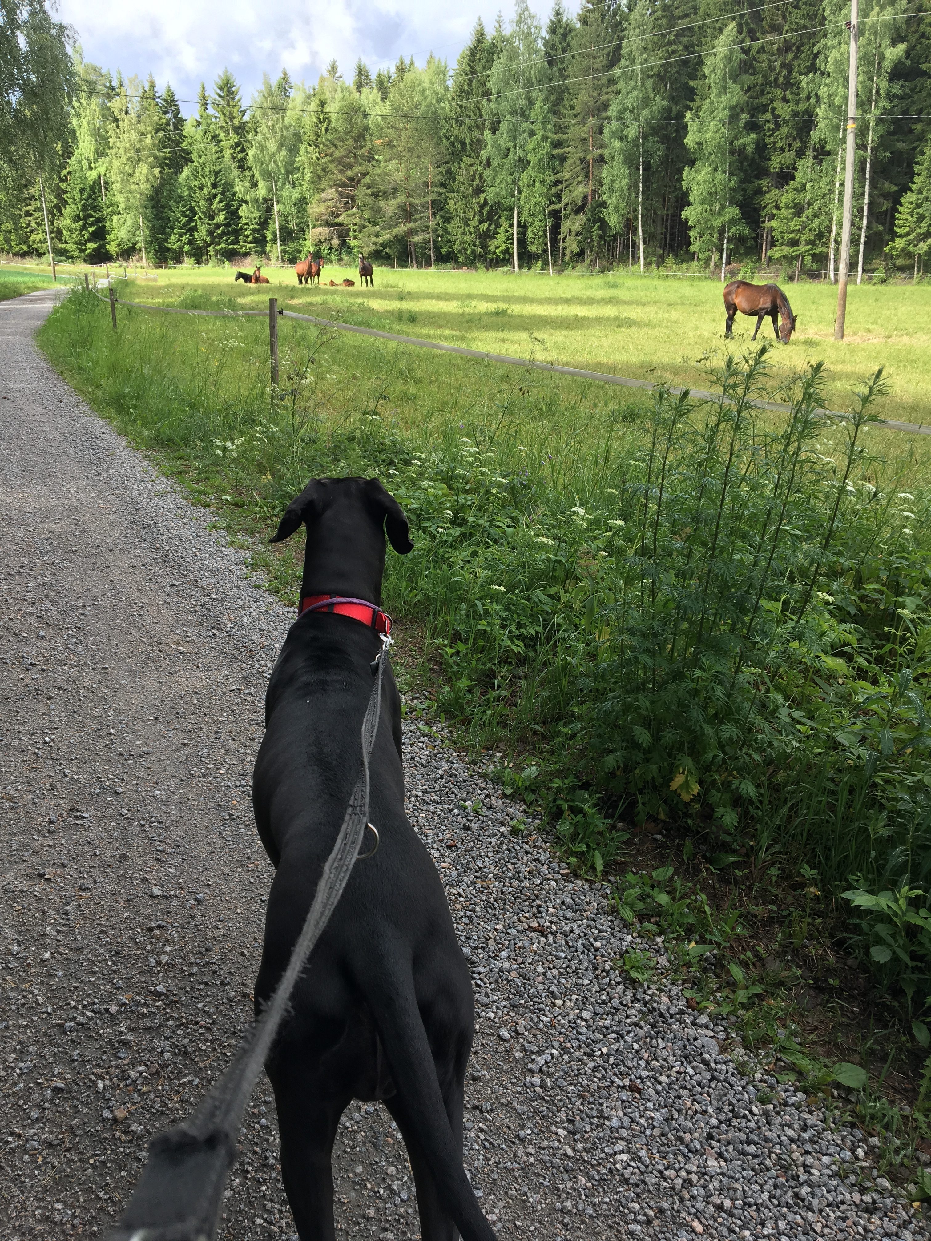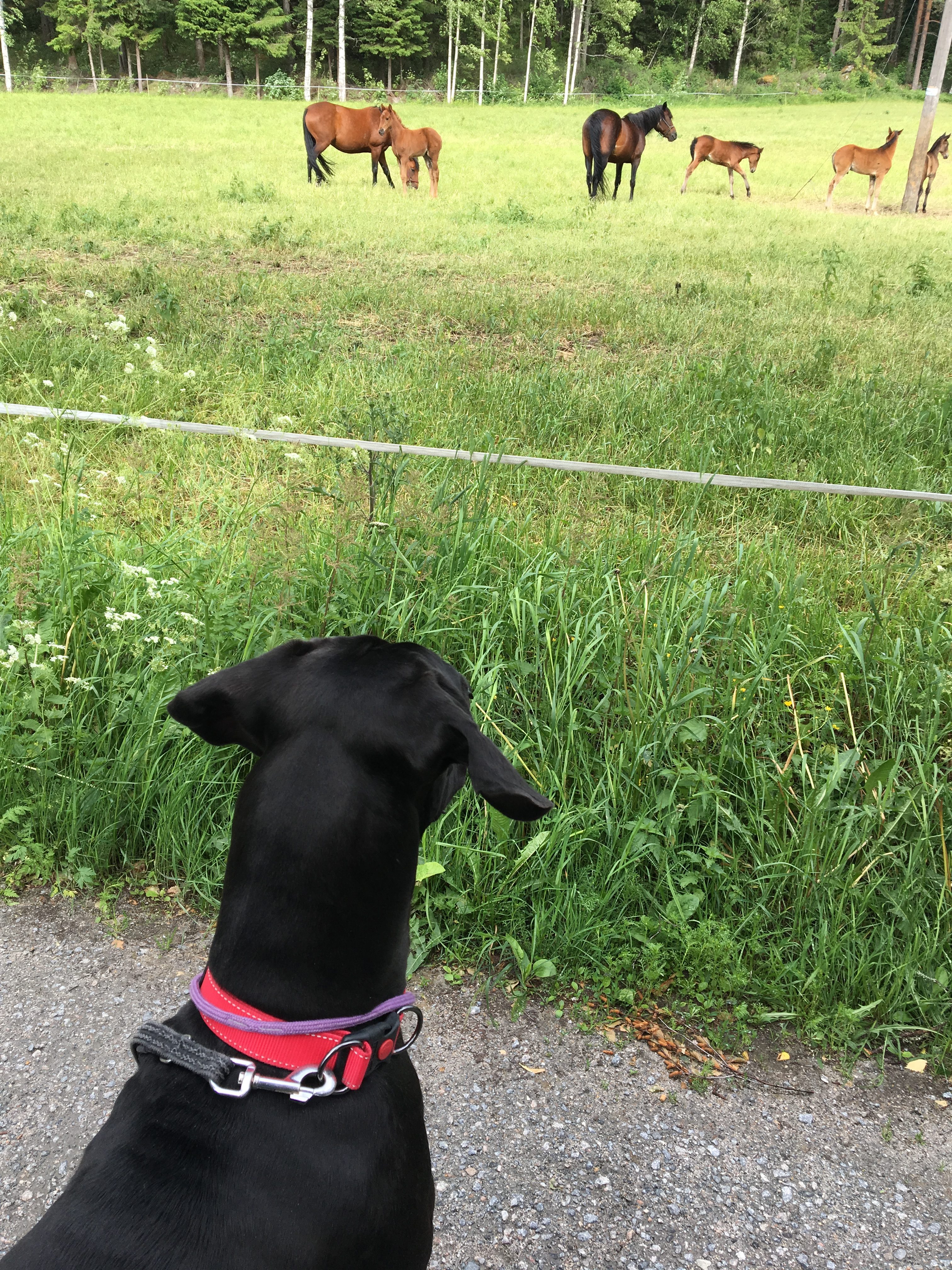 Jos mökkeillessä kerran joutuu lähtemään hihnalenkille, on siinä yksi hyvä juttu: nimittäin lenkin varrella pääsee ihmettelemään hevosia, ja näin alkukesästä myös pieniä varsoja. <3 Nemillä oli taas jännää!