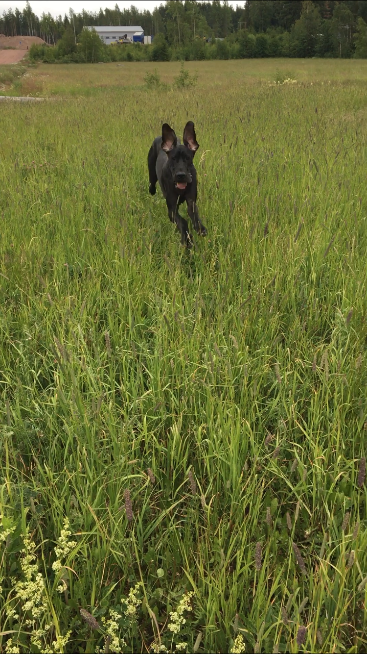 Aloitetaanpa ihan ensimmäisenä tärkeimmästä: Nemi sai tänään tikit pois! Haavan paraneminen jatkui erinomaisesti, ja nyt tikit tosiaan saatiin pois! Ensipuraisu vapauteen korkattiin mahaakutittelevan pitkäksi kasvaneella kesantopellolla. Kumpikin meistä huokaa helpotuksesta: Vapaus, täältä tullaan!