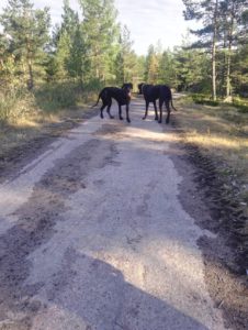 Nemi sai olla hoidossa jopa kaksi yötä. Ja hyvin oli mennyt! Metsälenkillä ja pihalla vauhtia oli riittänyt sopivasti, mutta sisällä koirat osasivat rauhoittua hyvin. Ainoa mutta oli tapahtunut metsälenkillä, kun Nemi ihan omatoimisesti teloi itseään! Se oli yrittänyt hypätä ison ja laakean kiven päälle, mutta syystä tai toisesta hypyn suunnittelu ja tähtäys epäonnistui ja koira oli jysähtänyt kiveä päin rinta ja lapa edeltä. Hetken aikaa Nemi oli valittanut vasenta etustaan, mutta kun särky laantui, ei äksidentistä jäänyt kuin muisto vain. Mutta pöljä mikä pöljä!