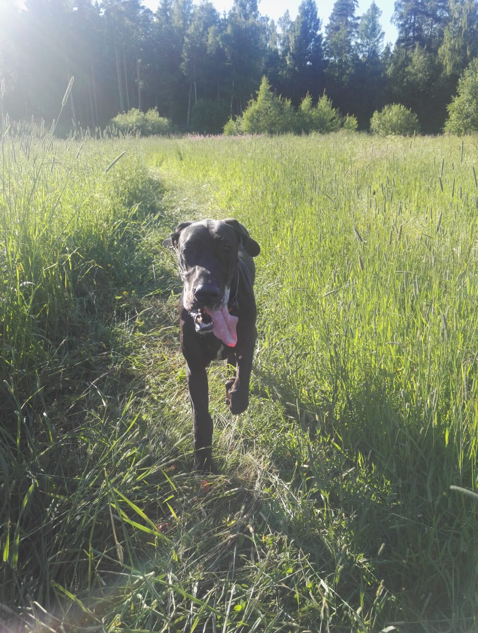 Nemi sai olla hoidossa jopa kaksi yötä. Ja hyvin oli mennyt! Metsälenkillä ja pihalla vauhtia oli riittänyt sopivasti, mutta sisällä koirat osasivat rauhoittua hyvin. Ainoa mutta oli tapahtunut metsälenkillä, kun Nemi ihan omatoimisesti teloi itseään! Se oli yrittänyt hypätä ison ja laakean kiven päälle, mutta syystä tai toisesta hypyn suunnittelu ja tähtäys epäonnistui ja koira oli jysähtänyt kiveä päin rinta ja lapa edeltä. Hetken aikaa Nemi oli valittanut vasenta etustaan, mutta kun särky laantui, ei äksidentistä jäänyt kuin muisto vain. Mutta pöljä mikä pöljä!