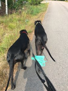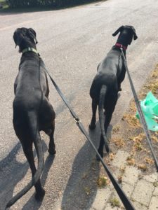 Torstaina kävin koirien kanssa pienellä hihnalenkillä harjoittelemassa parin ison otuksen kanssa liikkumista. Aluksi taas haettiin hetki kuvioita, mutta alun ihmettelyjen jälkeen sain hienosti talutettua 130 kiloa koiraa yhdellä kädellä 🙂 Hienoja lapsia nämä ovat; hyvin käyttäytyviä! Tosin, en päässyt/joutunut testaamaan koiraohitusta, ja hyvä ehkä niin 😉
