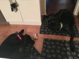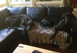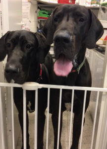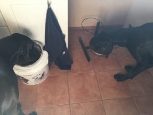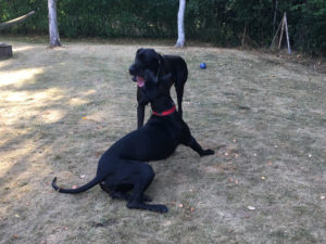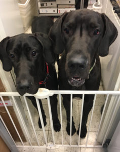 Perjantaista on pakko mainita! Minulla oli lyhyempi työpäivä, joten mitäs muuta kuin nappasin molemmat koirat autoon ja otin koirat töihin mukaan! Todistettavasti meidän kompaktin kokoiseen takatilaamme mahtuu kaksi tanskandoggia 🙂