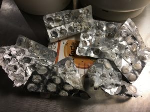 Ruokia ei, kuten kirjoitin, tietenkään jätetä tarjolle pöydälle kuin se kuuluisa Manun illallinen. Ratsaustaipumus ottaa vaan koko ajan pahempia piirteitä ja nenä yltää koko pitemmälle pöytäpinnoilla. Viimeisen kuukauden aikana Nemin kitusiin on kadonnut keittiön pöytätasoilta ainakin pari pakettia Canikuria, kokonainen paketti Inupekt Fortea, viime viikolla se söi paketin Ruisneppareita. Mutta nyt mittani on täysi: Viime viikolla Nemi on ottanut pöydältä paitsi sen oman maitohappobakteeripurkin ja syönyt sen sisällön (jäljellä onneksi vain noin parin päivän annos), mutta sen lisäksi vasta juuri avatun nivelvalmistepurkin! Purkin sisältö, kahden viikon satsi nivelvalmisteita, on syöty viimeistä murua myöten ja purkki palasiksi pureskeltuna! Nämä purkit eivät todellakaan olleet missään keskellä pöytää tyrkyllä, vaan koira on joutunut jo oikeasti näkemään yritteliäisyyttä saadakseen purkit keittiötason kulmasta.
