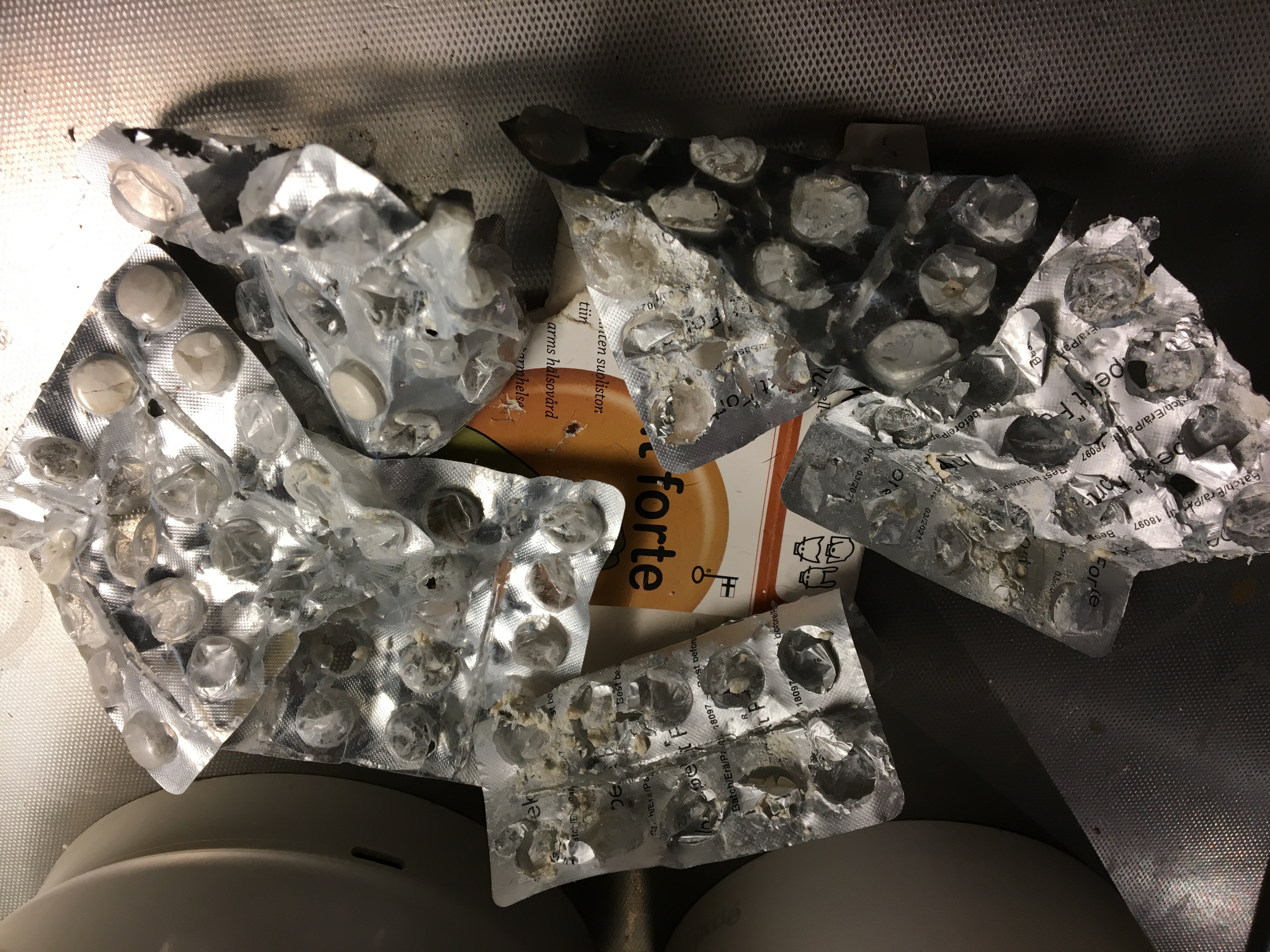 Ruokia ei, kuten kirjoitin, tietenkään jätetä tarjolle pöydälle kuin se kuuluisa Manun illallinen. Ratsaustaipumus ottaa vaan koko ajan pahempia piirteitä ja nenä yltää koko pitemmälle pöytäpinnoilla. Viimeisen kuukauden aikana Nemin kitusiin on kadonnut keittiön pöytätasoilta ainakin pari pakettia Canikuria, kokonainen paketti Inupekt Fortea, viime viikolla se söi paketin Ruisneppareita. Mutta nyt mittani on täysi: Viime viikolla Nemi on ottanut pöydältä paitsi sen oman maitohappobakteeripurkin ja syönyt sen sisällön (jäljellä onneksi vain noin parin päivän annos), mutta sen lisäksi vasta juuri avatun nivelvalmistepurkin! Purkin sisältö, kahden viikon satsi nivelvalmisteita, on syöty viimeistä murua myöten ja purkki palasiksi pureskeltuna! Nämä purkit eivät todellakaan olleet missään keskellä pöytää tyrkyllä, vaan koira on joutunut jo oikeasti näkemään yritteliäisyyttä saadakseen purkit keittiötason kulmasta.