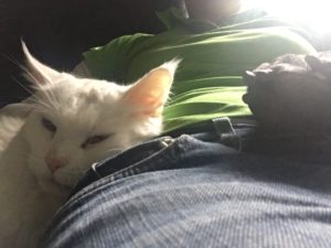 Lumi hakeutuu helposti kainaloon tai syliin kehräämään ja puskemaan, ja aika usein siinä toisessa kainalossa saattaakin makoilla yksi Pikkumusta. Nemin rauhallisuudesta riippuen Lumikin saattaa jo tulla vähän lähemmäs Nemiä. Ensimmäisessä kuvassa oli jo oikeastaan harvinainen tilanne, jossa Nemi makoili sohvalla ja Lumi meni itse sen viereen nukkumaan!