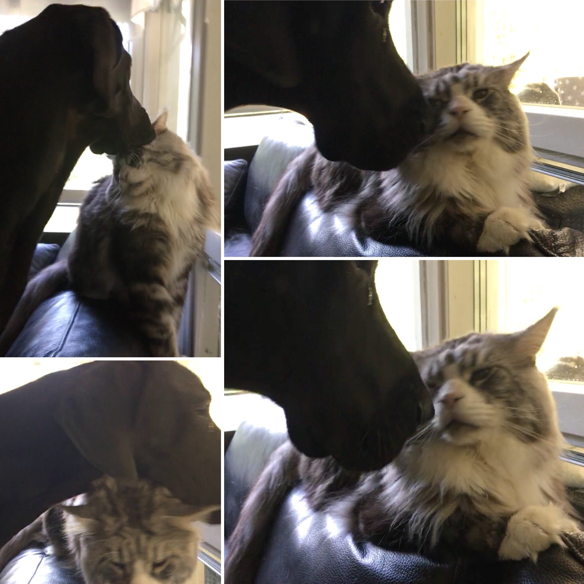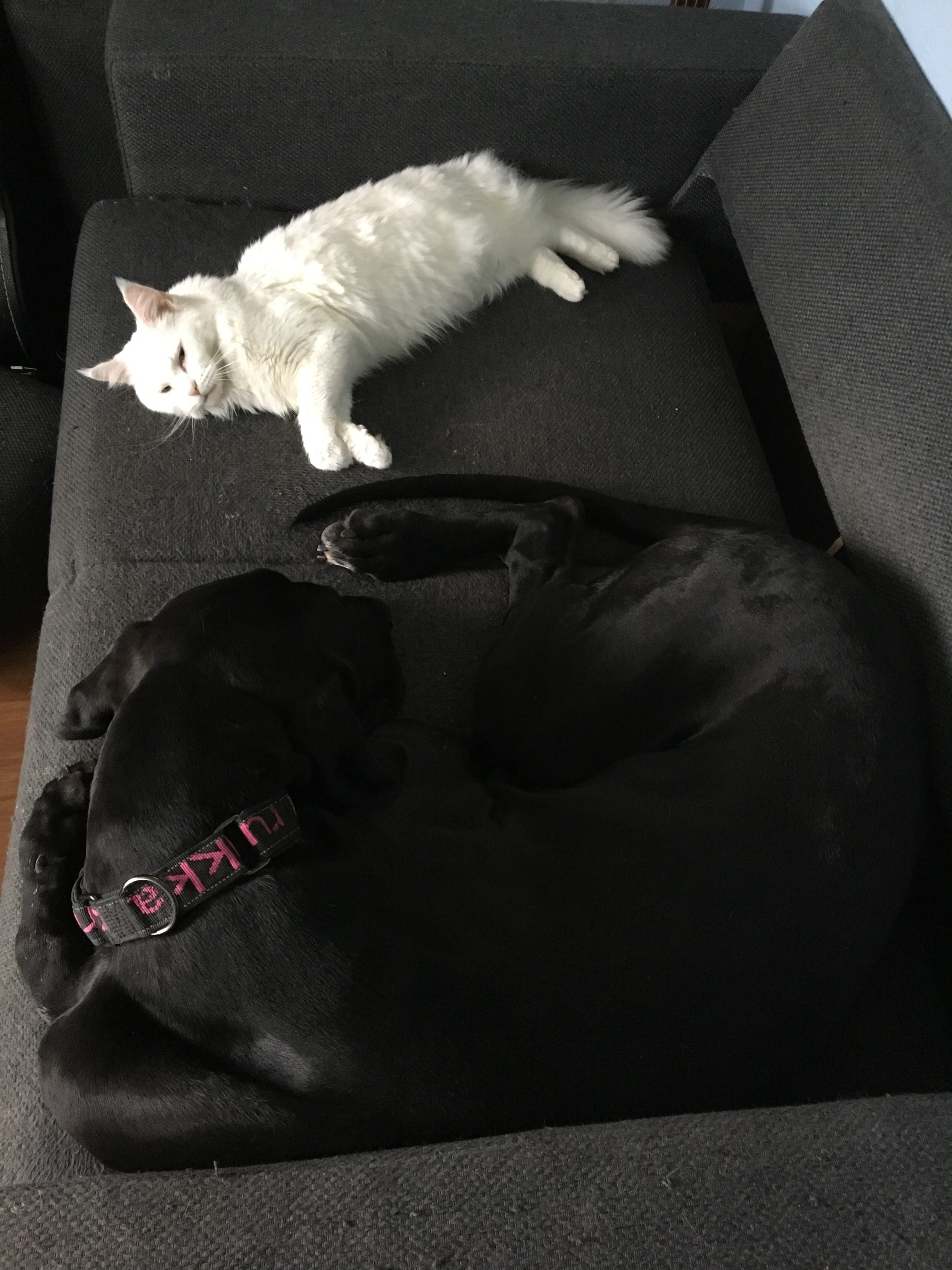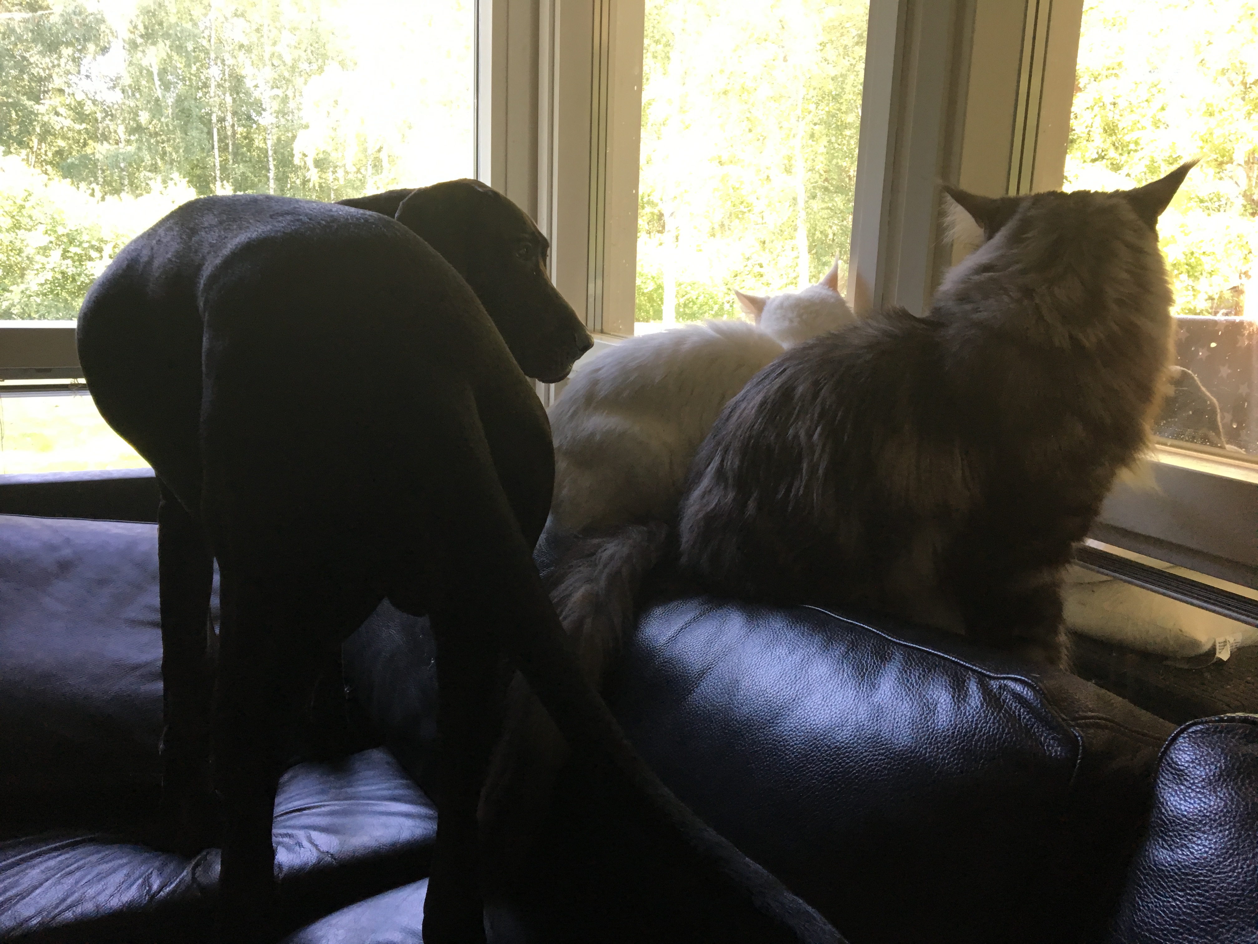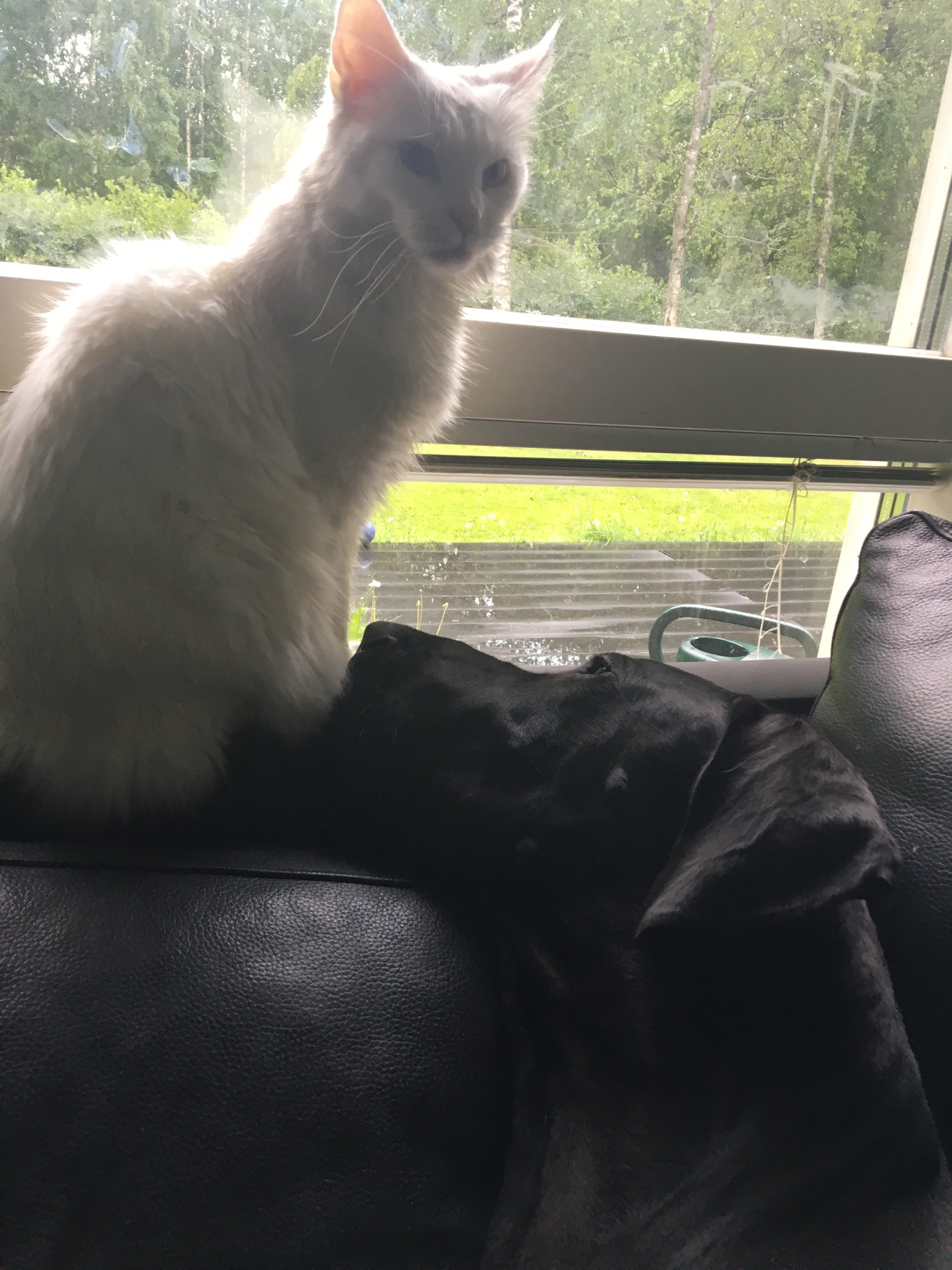 Yleisesti ottaen Nemi on ihan todella hienosti kissojen kanssa. Onhan tämä oletettavissakin, kun se on koko ikänsä kissojen kanssa kasvanut. Nemi ei hätkähdä kissojen äänistä ja touhuista, ja kissojen iltavilli-formulatkaan eivät saa Nemiä lähtemään niiden perään. Kissat kulkevat sujuvasti Nemin jaloissa ja hännät liuhuen ne alittavat Nemin mahan alta tai jalkojen välistä. Jos Nemi vain saisi vielä iiiihan vähän lisää malttoa välillä hieman nopeisiin liikkeisiinsä, niin uskon että Nemistä ja Lumista saadaan vielä kainaloikkain nukkuvat tyttöset. 🙂
