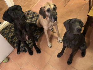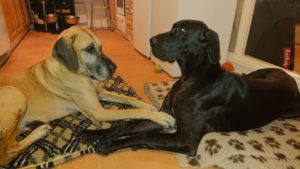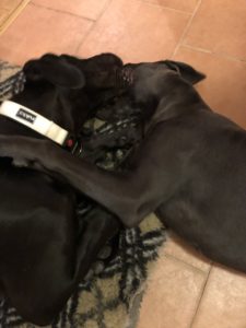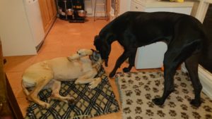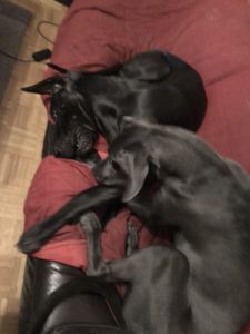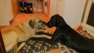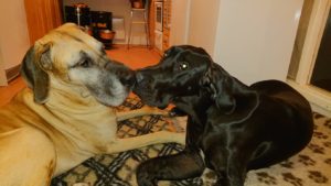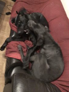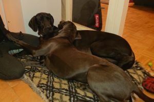 Puolivuotias Heklaati-neiti on kasvanut kovin vauhdikkaaksi pieneläimeksi, eikä se meinannut pysyä nahoissaan, kun me tulimme sisään. Suomeksi: pentu ehti kahdessa sekunneissa hypätä Nemin selän yli, kiertää sen mahan alta, haukata poskinahoista ja pyörähtää vielä itsensäkin ympäri. Niina komensi pentua, joka uskoi komentoa – mutta muisti komennon vain noin kaksi seuntia, jonka jälkeen sama ralli alkoi alusta 😀 Nemi suhtautui siniseen superhärveliin oikein hienosti (saattoi ehkä yrittää osallistua hammasteluun aina ohimennen), mutta ei esimerkiksi aloittanut leikkitouhuja itse – Niinan komentoääni puri myös Nemiin, ehkä jopa paremmin kuin Heklaan 😀 Ja Penni-Justiina komensi ja erotteli huonosti käyttäytyviä ja riehuvia kakaroita toisistaan sen minkä ehti. 😀